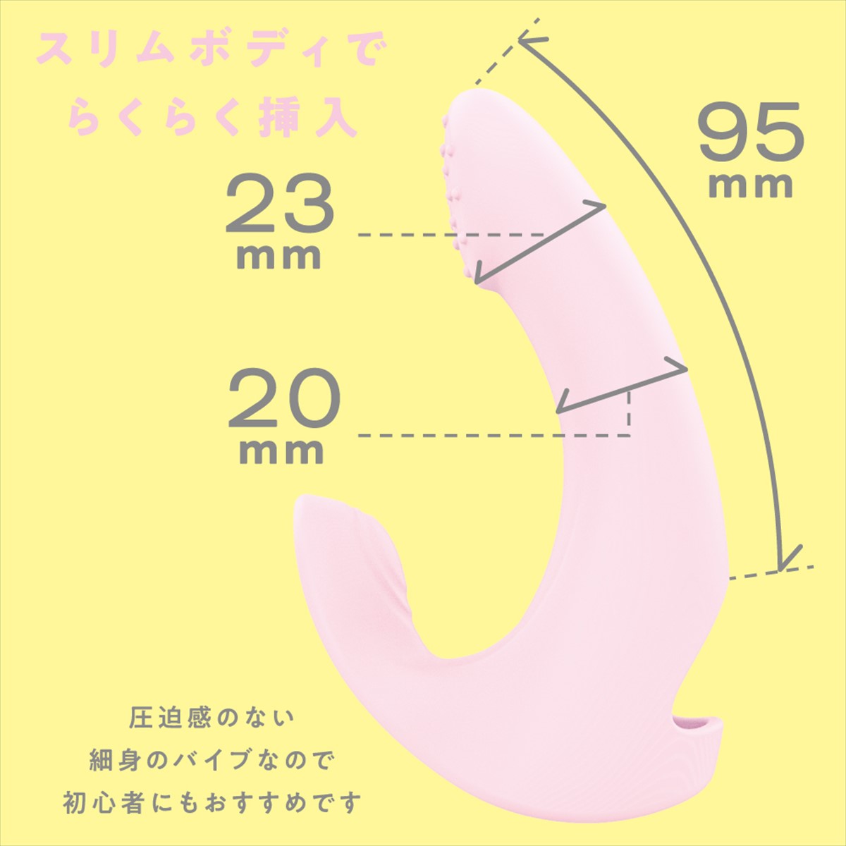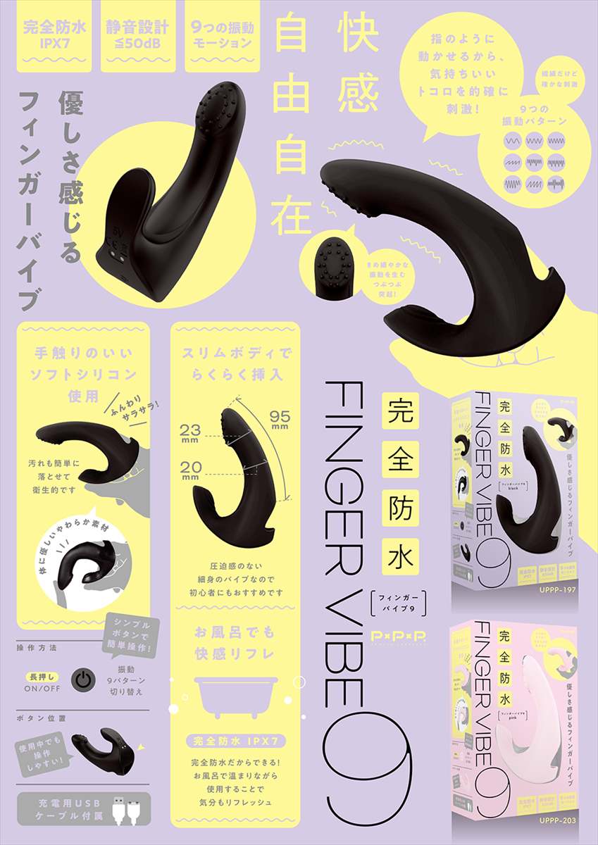 やさしさ感じるフィンガーバイブ!指のように自由に動かせるから、気持ちいいトコロを的確に刺激!最大直径23のスリムボディなので、挿入もラクラク。初心者にもおすすめです!ふんわりサラサラな高品質ソフトシリコン仕様。完全防水だから、お風呂でのリフレッシュタイムにも使えます。指よりも、衛生的で刺激的な愛撫をお楽しみください。完全防水IPX7等級。静音設計≦50db。9パターン振動。充電用USBケーブル付属。検査番号:2101080