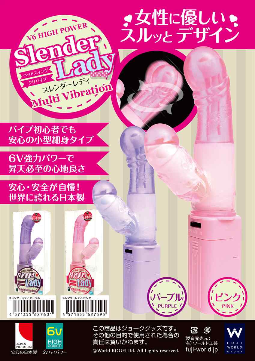 女性に優しいスルッとデザイン!!バイブ初心者でも安心の小型細身タイプですが、6V強力パワーのク●バイブとスイングは、ベテランユーザーも満足できる心地よさ。安心、安全が自慢の世界に誇れる日本製です。