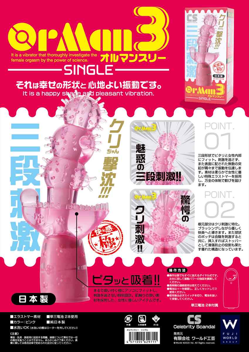 バイブ職人が女性の悦びを追求し、完成したオルマンスリー・シングル。手軽に、けれども最高に、気持ち良くなっちゃう一本です。三段形状の挿入部は女性の内側にぴったりフィット。そこに配された無数の突起が刺激を隅々まで伝達し、逃がしません。また根〇部分はク〇刺激に特化し、ブラッシングする様に優しく快楽へ導きます。球状のポッチは会〇部を刺激するとともに、挿入すればストッパーとして滑落防止の役割も果たします。素材にもこだわり、高級エラストマーをふんだんに使用した優しい肌触りが自慢です。日本国内で生産していますので、安心してお使いいただけると思います。
