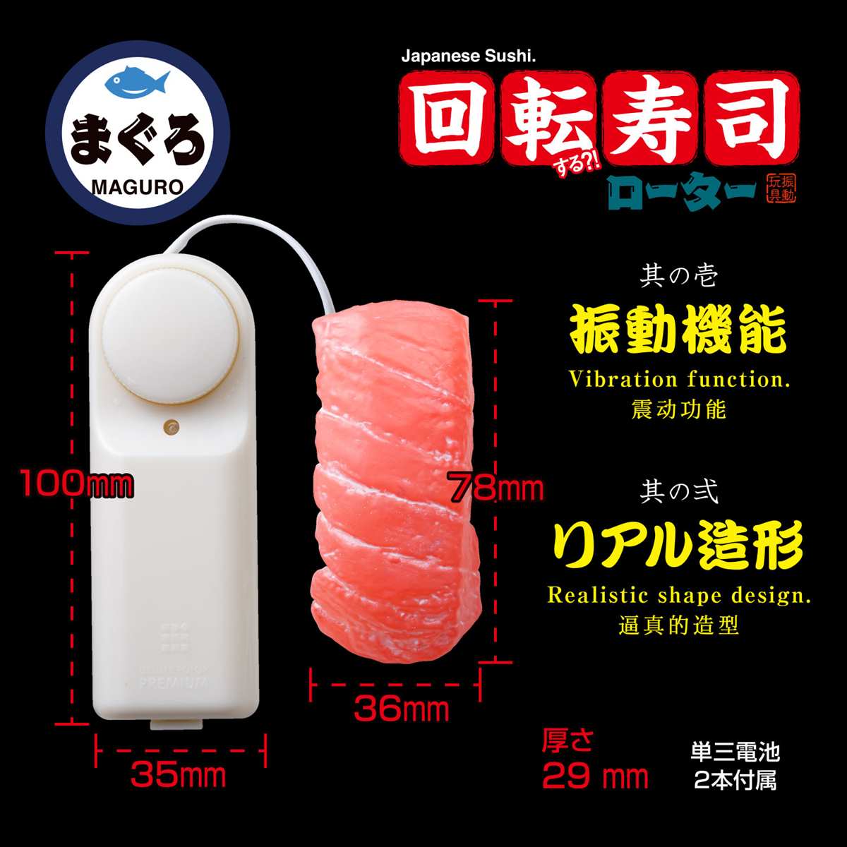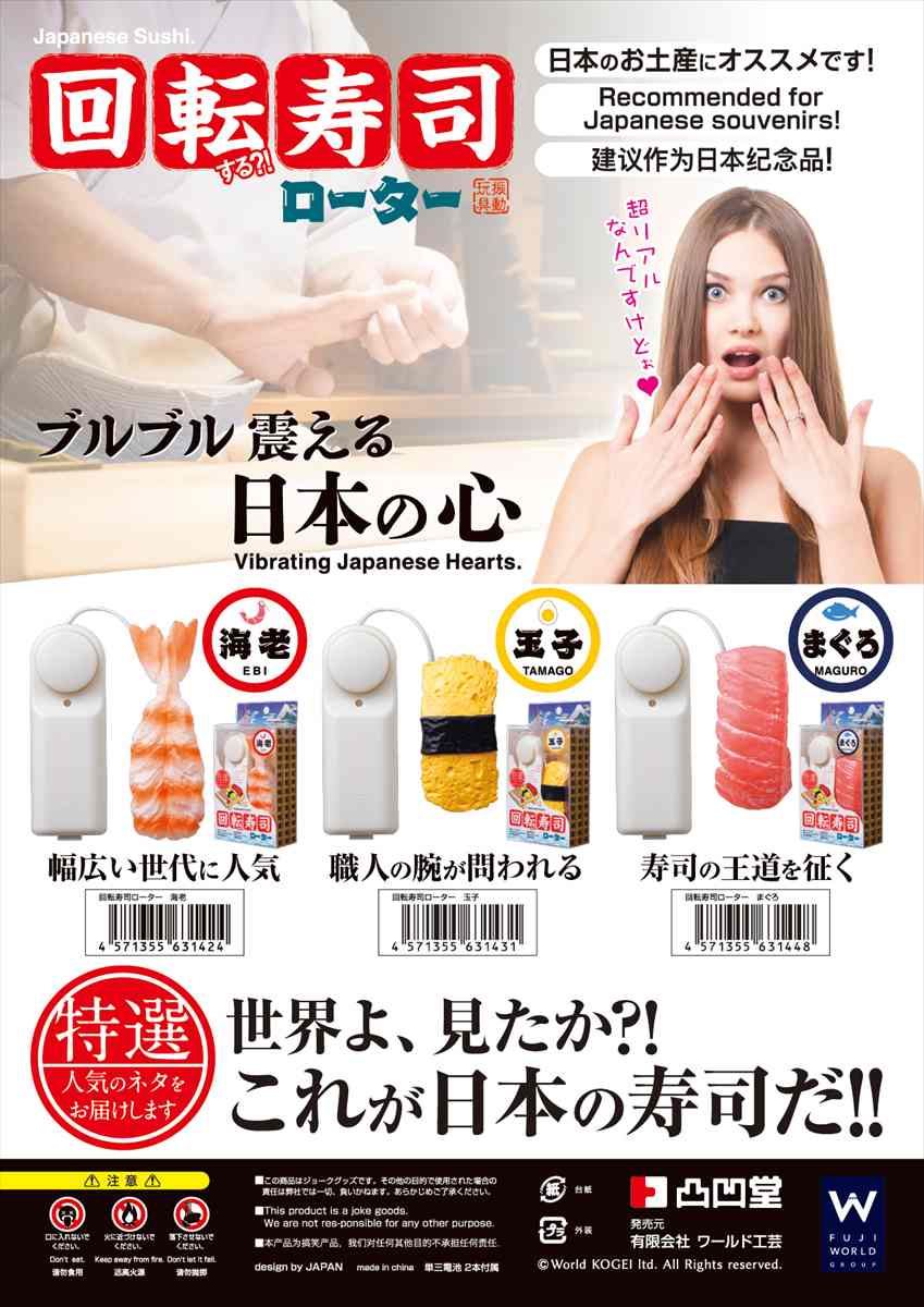 今度の凸凹堂は日本が誇る食文化・寿司!老若男女全世界で人気の寿司ネタが、ブルブル震えるオモチャになって登場です。最高級品は一貫5000円以上?! 寿司ネタの王様・まぐろ!そんなまぐろをリアルに再現したのがこちらの商品です。振動機能が付いているので、用途に合わせてブルブルさせちゃってください。日本を代表する食文化・寿司、海外の方へのお土産にも人気の一品です。プレゼント・お土産にオススメです。
