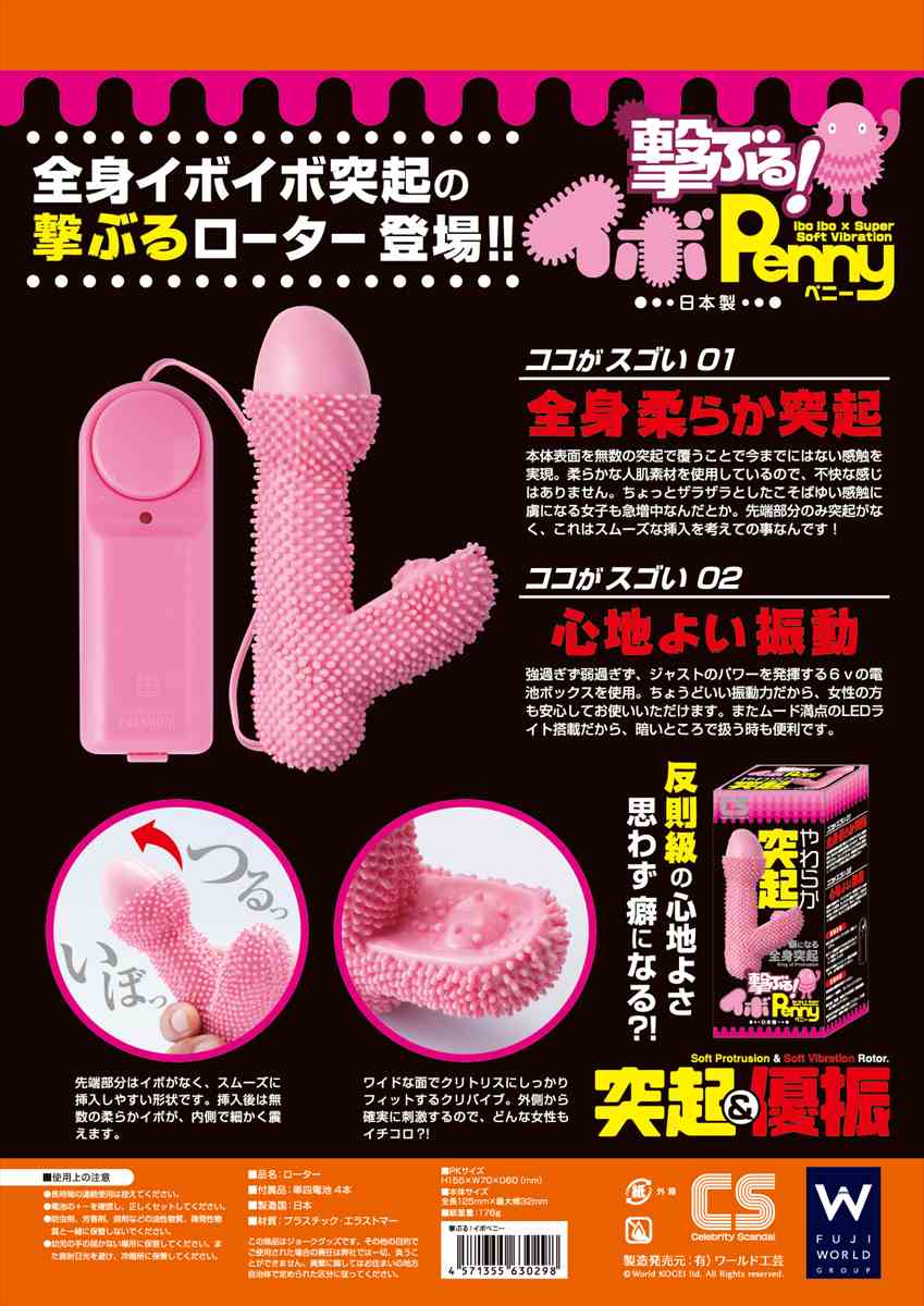 無数の全身突起が癖になる!?こんなバイブは見たことない、魅惑のイボイボバイブの登場です。この撃ぶる! イボペニー最大の魅力は全身に配された無数の突起です。振動するたびに細かく柔らかい突起がブルブル震え、くすぐったい様な刺激を与えてくれるでしょう。先端には突起がなく、ツルッとしているので、スムーズな挿入を可能にしています。またク●バイブは、広角な面でしっかりとク●ちゃんにフィット!刺激を確実に伝達してくれるスグレモノです。小型ながら、単四電池を4本使ったパワフルなイボペニー。見た目はゴツいですが、優しくパワフルな刺激が自慢です。日本国内で製造された安心・安全なニュータイプ・バイブです。