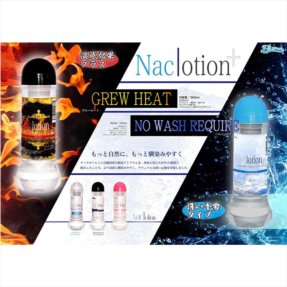 ナックローションは純国産の塩化ナトリウムを、体液と同じ0.85%の濃度に配合したことで、より身体に馴染みやすく、ナチュラルな使い心地を実現しました。グルーヒートは温感効果をプラスする事により使用しているうちに熱を感じられる冬にもピッタリな商品です。日本製 内容量360ml
