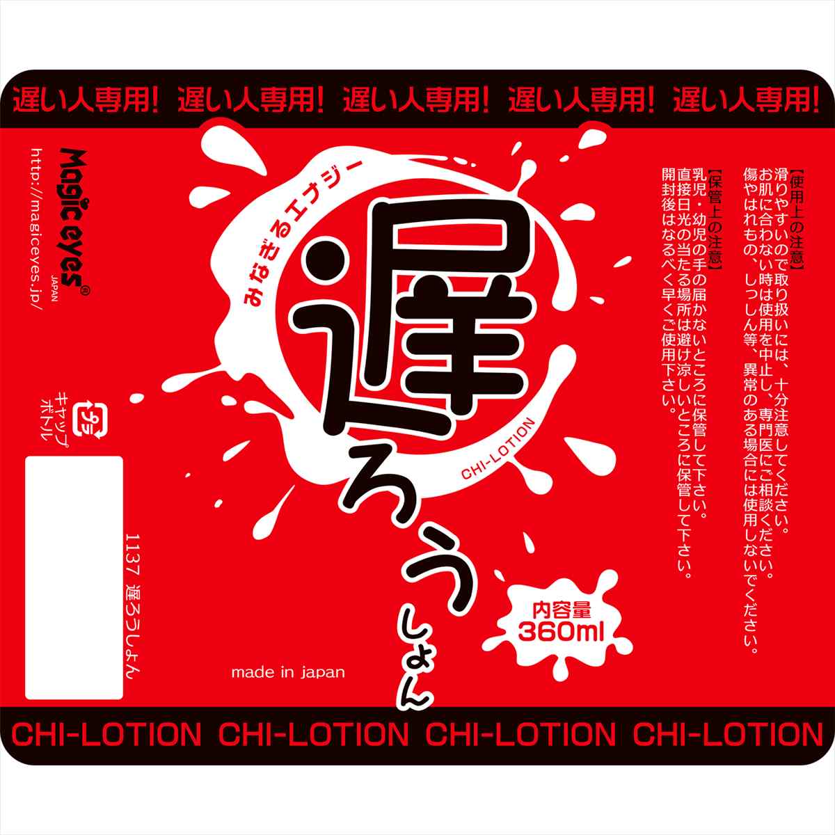 【使用上の注意】滑りやすいので取り扱いには、十分注意してください。お肌に合わない時は使用を中止し、専門医にご相談下さい。傷やはれもの、しっしん等、異常がある場合には使用しないで下さい。直射日光は避けて保管して下さい。遅い人専用!遅ろうしょん!!分かる人にはわかる使用感!?もっと熱いプレイを楽しみたい方にオススメ。中粘度スタンダードタイプだからグッズの使用にも最適。安心安全日本製ならではのハイクオリティーローションです!マムシエキス配合。たっぷり使える内容量360ml。