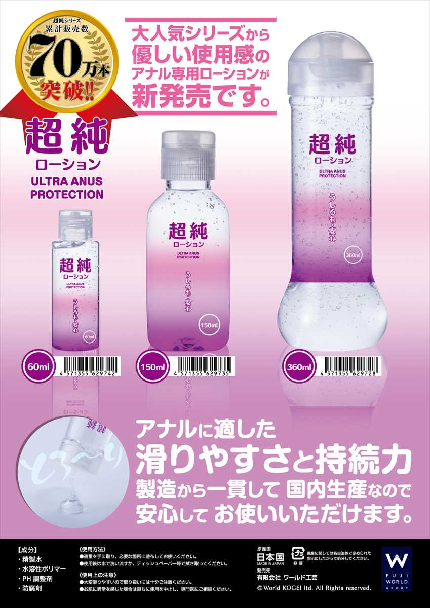 「うしろも・安心」をモットーに作られたア〇ル専用ローションです。ア〇ルに適した潤滑性能と持続を発揮し、プレイを盛り上げます。ローション選びに迷ったら超純で間違いなし!