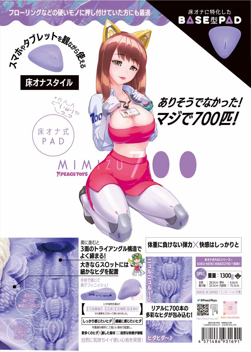 『体重に負けない弾力×快感はしっかりと』床オナ式PADシリーズとKAKU-MEIKI MIMIZU700が合体!!床オナ式PADにKAKU-MEIKI MIMIZU700の内部構造を採用!床オナ式PAD専用の素材をベースに、よりヒダを感じられるように配合した素材を使用しました。「しっかり感じたいヒダ」「繊細に感じたいヒダ」を最適な場所に、丁度いい素材で配置し、『数多くのヒダ×適した素材=自然な快感が増幅』自然に気持ちイイ使い心地を実現!この素材の最適アレンジにより、床オナの体重に負けず、より主張するヒダの快感をたっぷり味わえるようになりました。床オナ二ストの皆様にもほんとうにあった!リアルミミズ700匹!MIMIZU700をご堪能いただけますと幸いです。ハンドホールでは味わえない!得られない!満足感はハンパじゃない!スマホやタブレットを観ながら使える床オナスタイルをお楽しみください♪