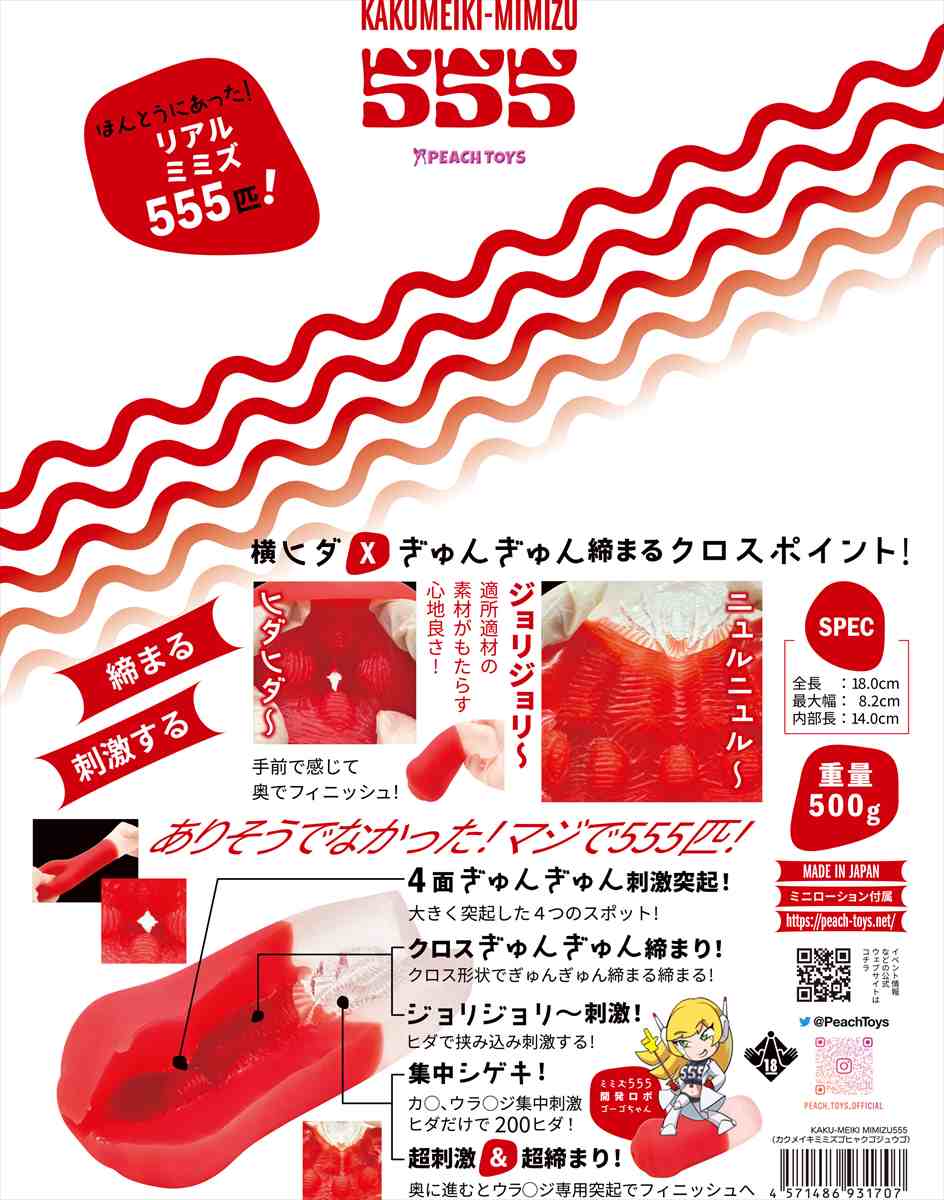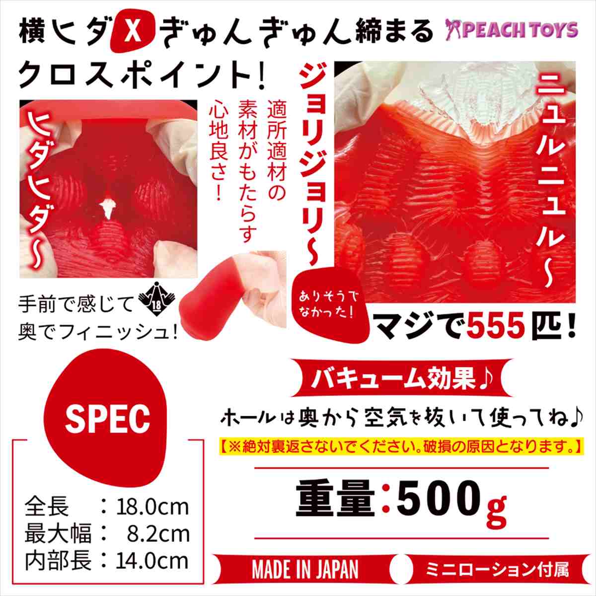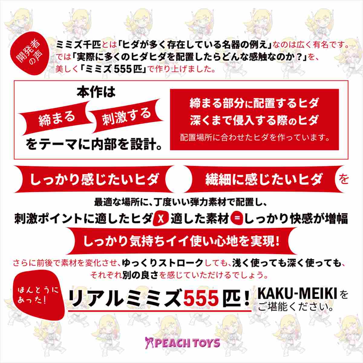 名器に革命!『KAKU-MEIKI MIMIZU555(カクメイキミミズゴヒャクゴジュウゴ)』の登場です。ミミズ千匹とは「ヒダが多く存在している名器の例え」なのは広く有名です。では「実際に多くのヒダヒダを配置したらどんな感触なのか?」を美しく「ミミズ555匹」で作り上げました。本作は「締まる/刺激する」をテーマに内部を設計。締まる部分に配置するヒダ、深くまで侵入する際のヒダなど配置場所に合わせたヒダ。「しっかり感じたいヒダ」「繊細に感じたいヒダ」を最適な場所に、丁度いい弾力素材で配置し、『刺激ポイントに適したヒダ×適した素材=しっかり快感が増幅』しっかり気持ちイイ使い心地を実現!さらに前後で素材を変化させ、ゆっくりストロークしても、浅く使っても深く使っても、それぞれ別の良さを感じていただけるでしょう。ほんとうにあった!リアルミミズ555匹!KAKU-MEIKIをご堪能ください。