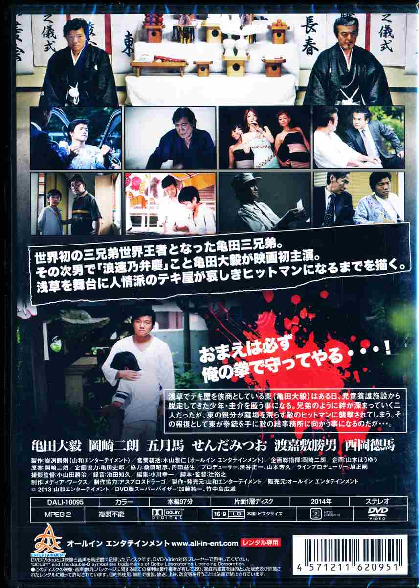 ”浪速乃弁慶”こと亀田大毅の映画初主演作。浅草でテキ屋をしている東は、ある日児童養護施設から脱走した少年・圭介を匿うことに。兄弟のように絆が深まっていくふたりだったが、そんな折、東の親分が庭場を荒らす敵のヒットマンに襲撃されてしまう。