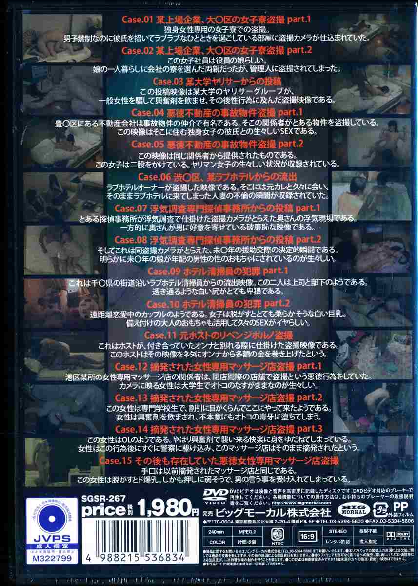 オンナが誰にも見られていないと油断する瞬間、輩に仕掛けられたカメラだけがその一部始終を見ていた。まさにノンフィクションドキュメント!そんなAV会社に投稿された盗撮映像の中から、是非見てほしいスタッフお勧めの映像クリップ集!!某企業の女子寮、ラブホテル、オイルマッサージ店、悪徳不動産による賃貸アパート、と盗撮のカメラは自由自在に仕込まれている!女達を数日間にかけて盗撮し続け〜痴態を晒す乱れた日々を公開!リアルな姿は必見!!