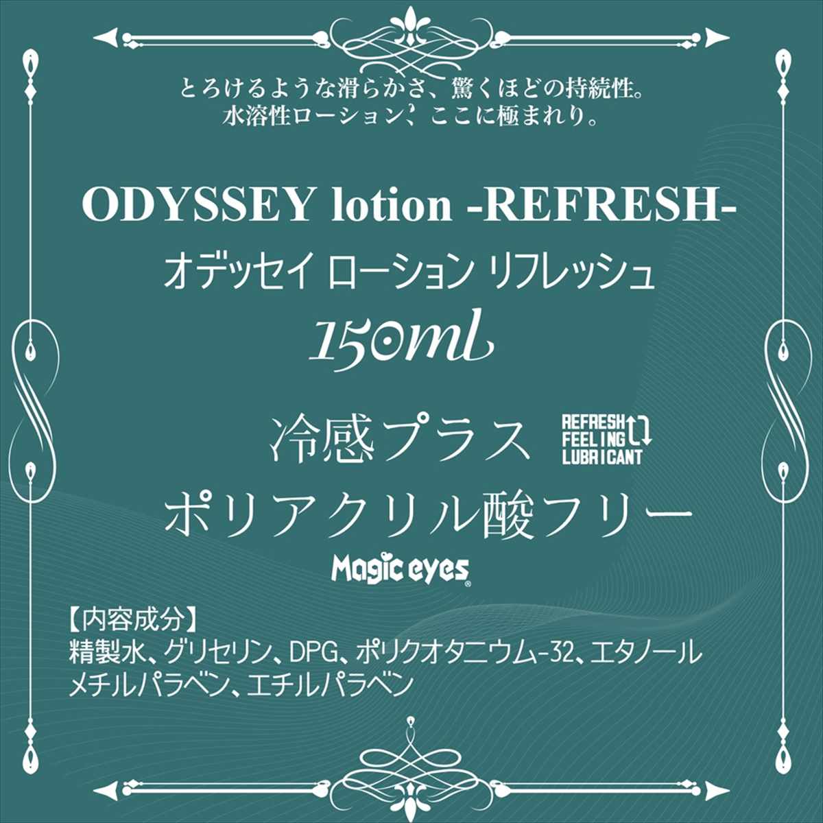 ポリアクリル酸フリーの水溶性ローションでありながらオイルローションのような滑らかな使用感。糸を引くようなタイプのローションでは無いので馴染ませながら少しずつ量を増やしていって下さい。REFRESHは冷感タイプなので暑い時はもちろん使用後の清涼感を求める方には最適です。ボトルにはワンタッチキャップを採用しておりますので取り回しも簡単です。150mlの使い切りタイプ。日本製