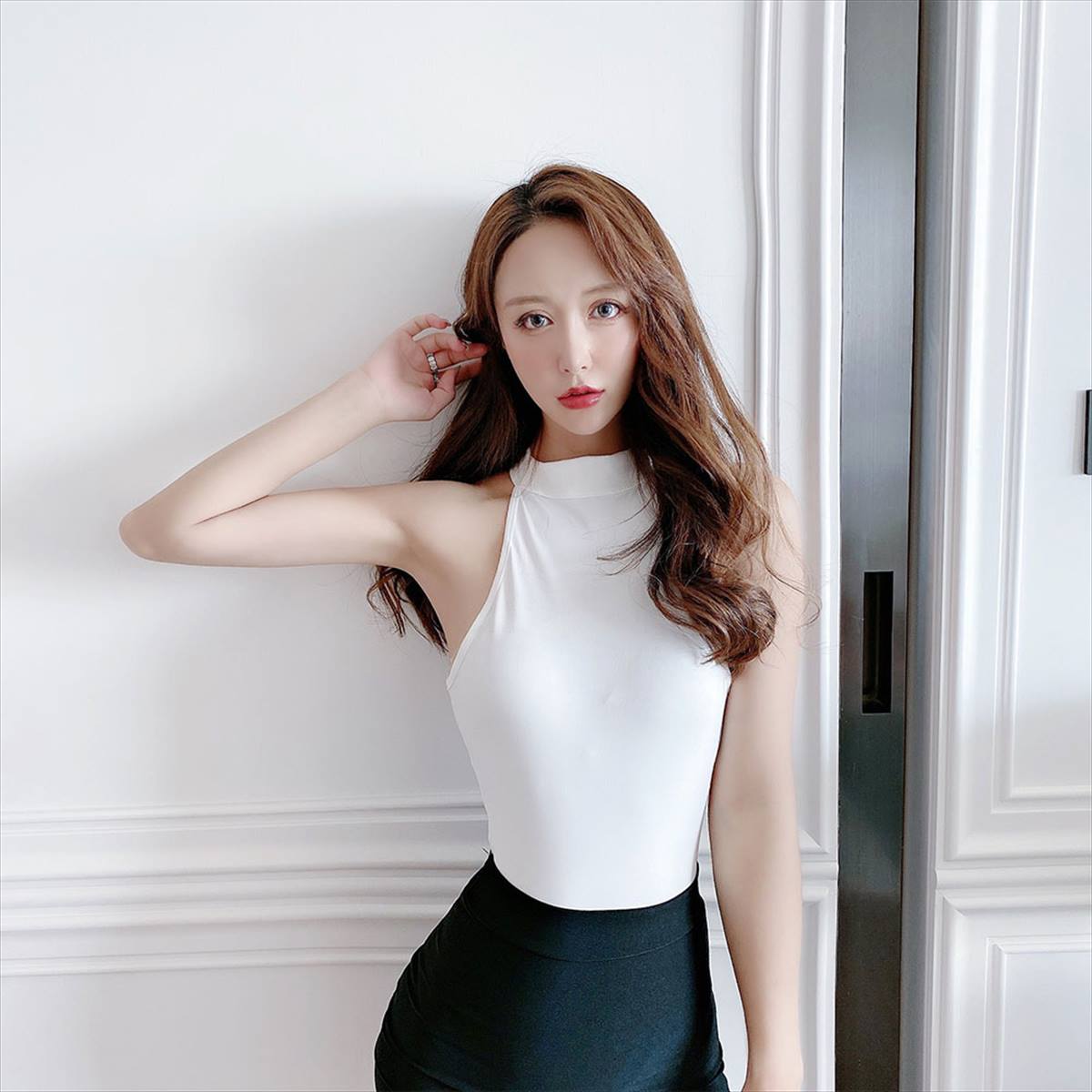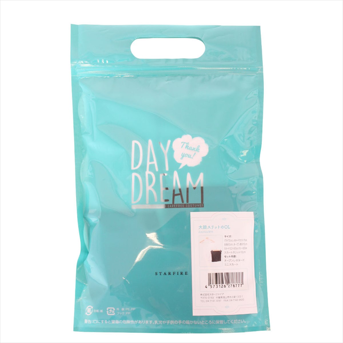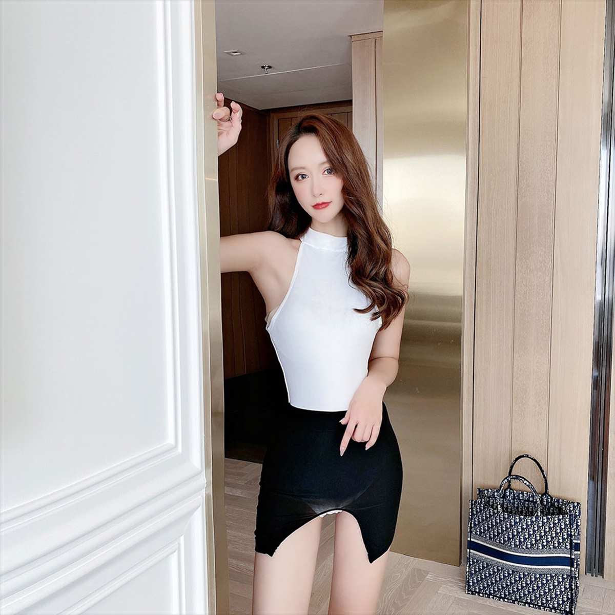 白のオープンレオタードに映える黒のミニスカートが刺激的なオフィス制服。スカートのスリットは前でも後でも自由に着こなして!