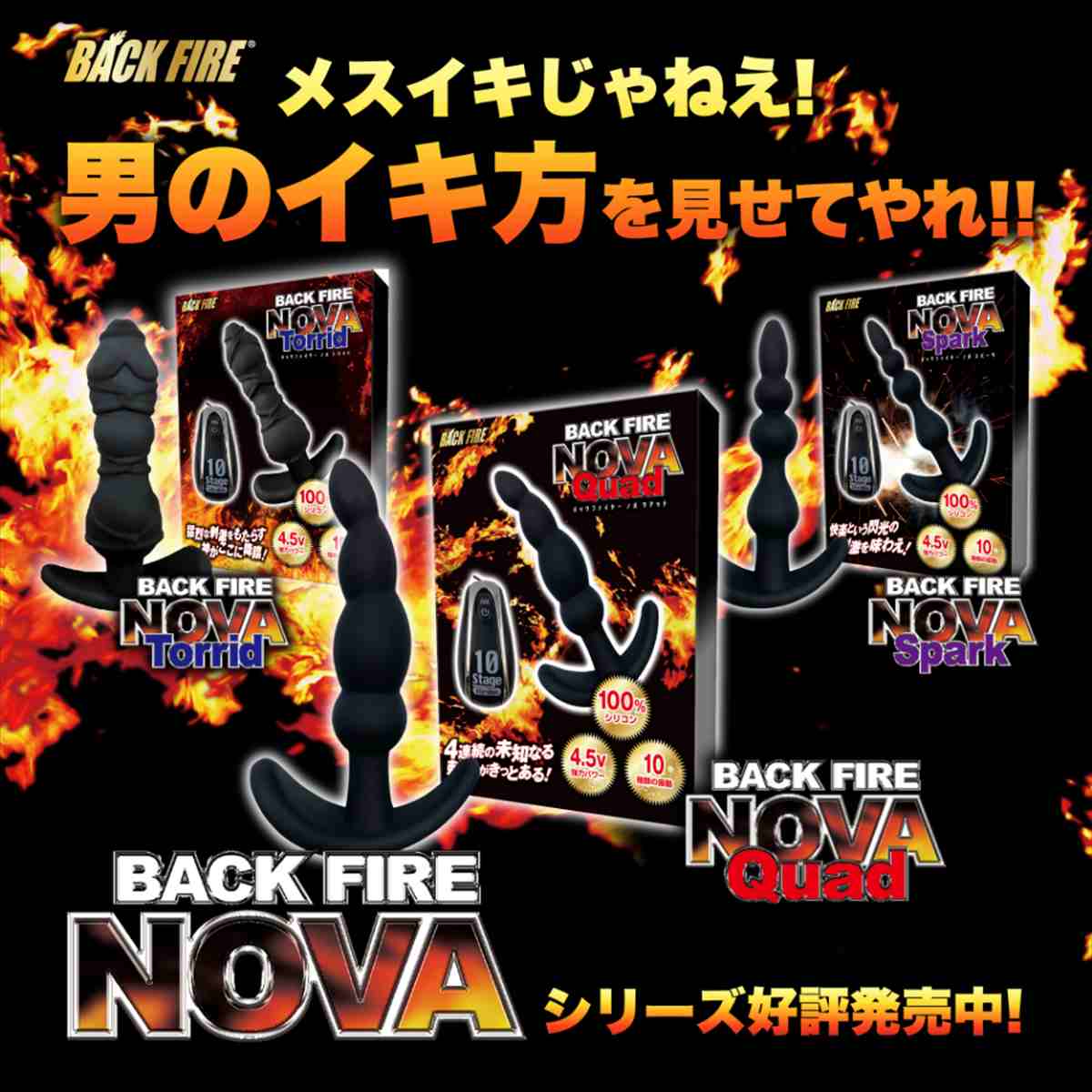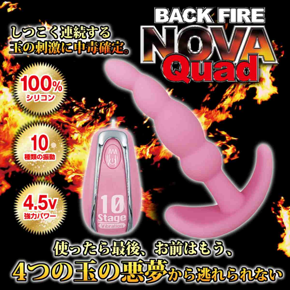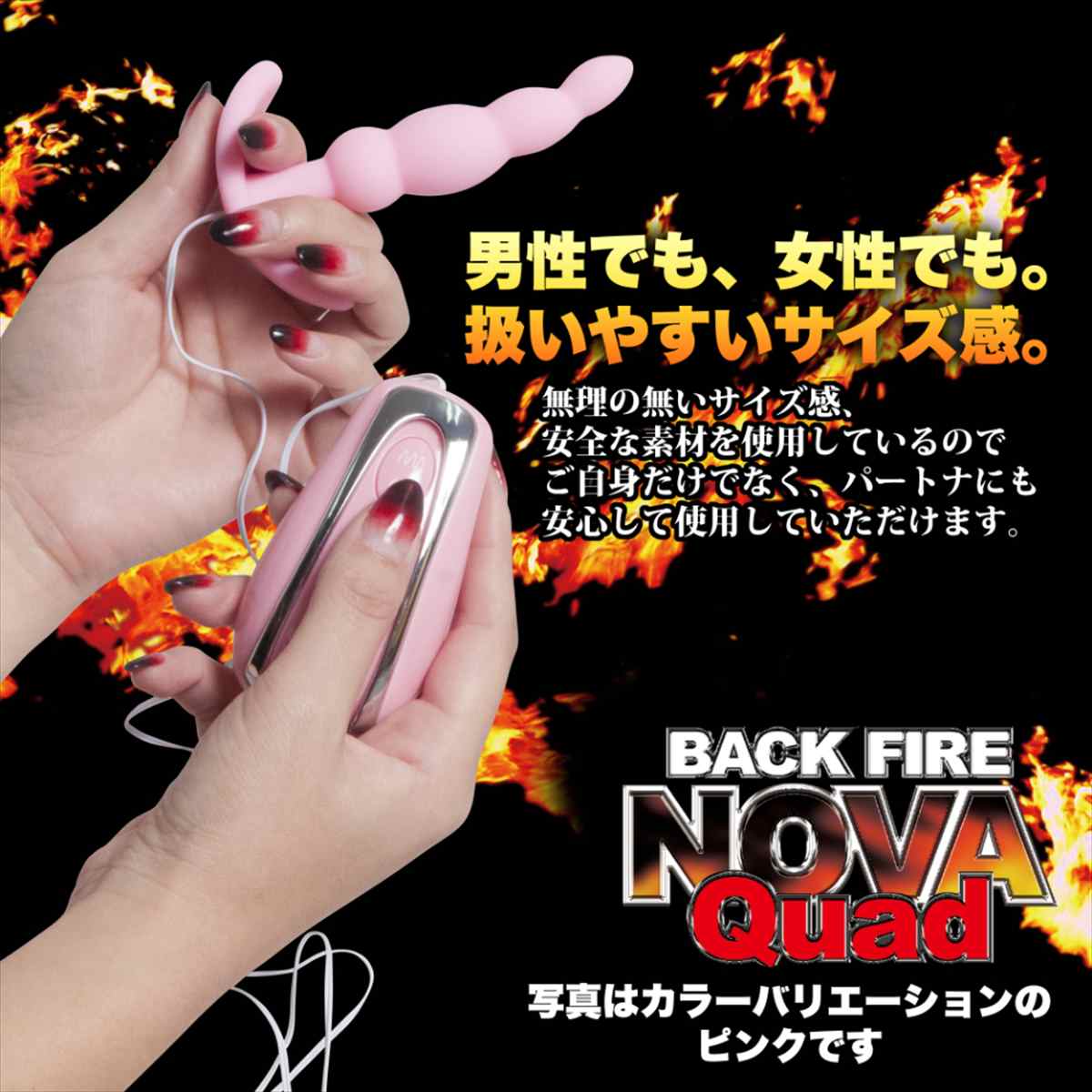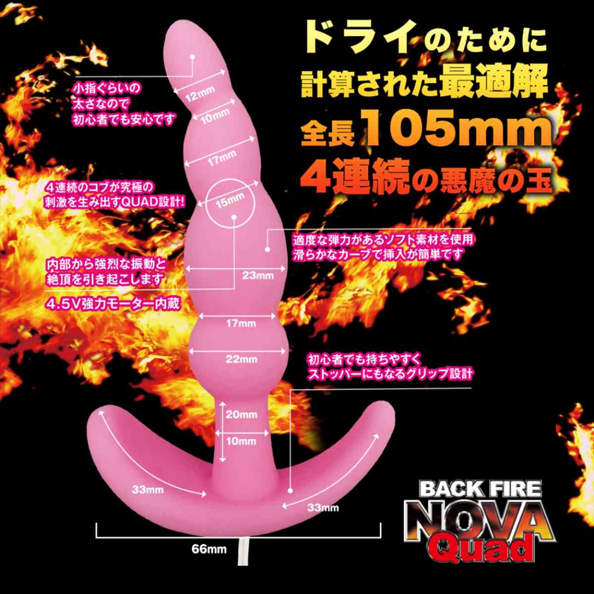 大人気のバックファイアーシリーズに、初心者向けから中級者向けラインの「NOVA」シリーズが新登場!ア●ル挑戦をしてみたいけど…と悩んだら、NOVAシリーズがおすすめ!クアッドは、座薬の位の大きさの1センチの先端から始まり、指のような緩やかな、カーブで1.7センチ、2.3センチ、2.2センチの大きさのコブが続きます。全部で4連続の(クアッド)の隆起が続く設計になっています。内部に密着し、緩やかなカーブが、前●腺やGス●ットなどをダイレクトに刺激します。奥まで入れると、入り口付近で強烈な振動と快感を引き起こすスタイルになっています。10段階の振動の切り替えと4.5Vの強力な振動パワーを備えた、100%シリコンのプラグです。グリップにもストッパーにもなる台座部分は、安心の66mm幅で、確実にSTOPします。ピンク色と黒色の2色ありますので、お好きな色でセルフプレイも、パートナーとのプレイでも楽しめます。