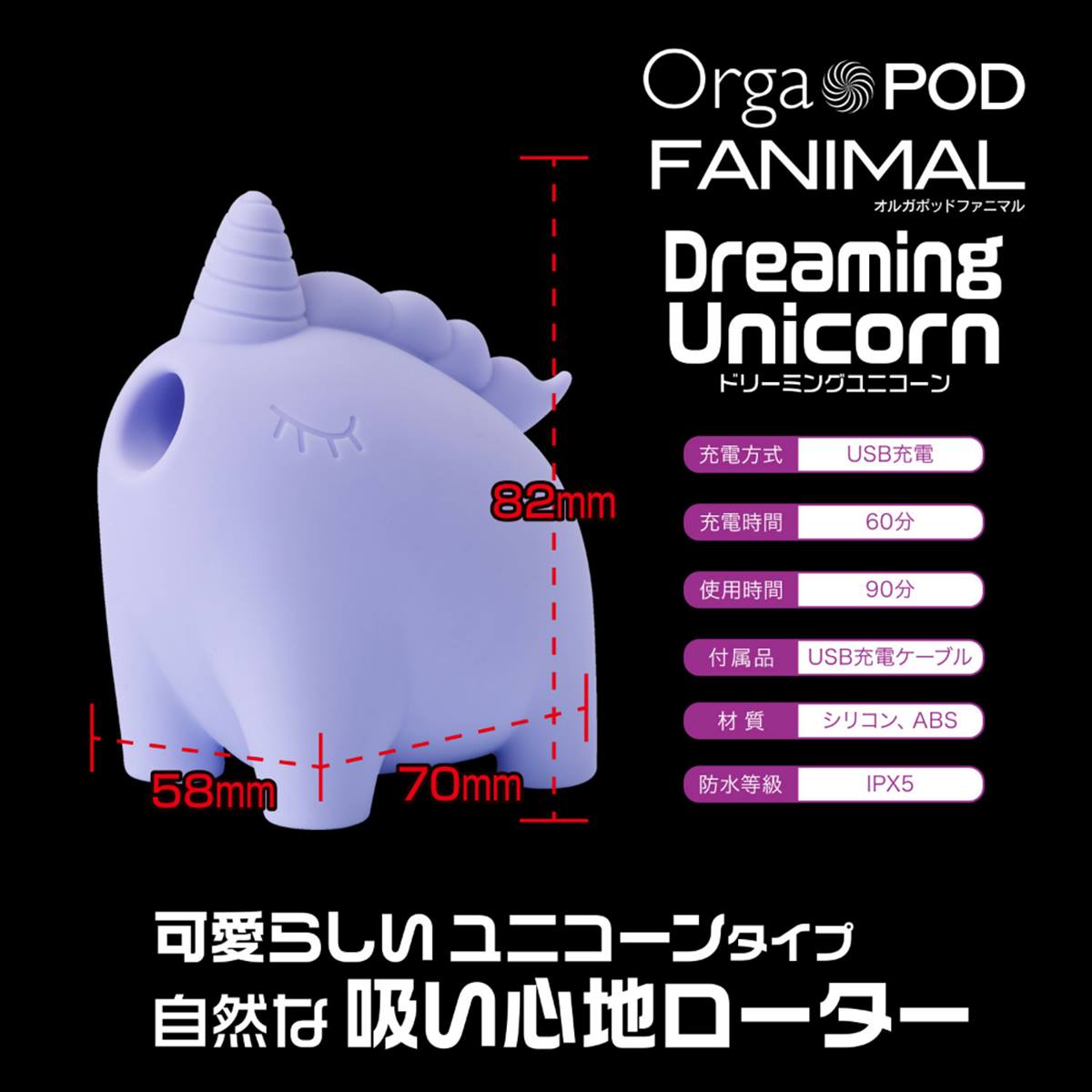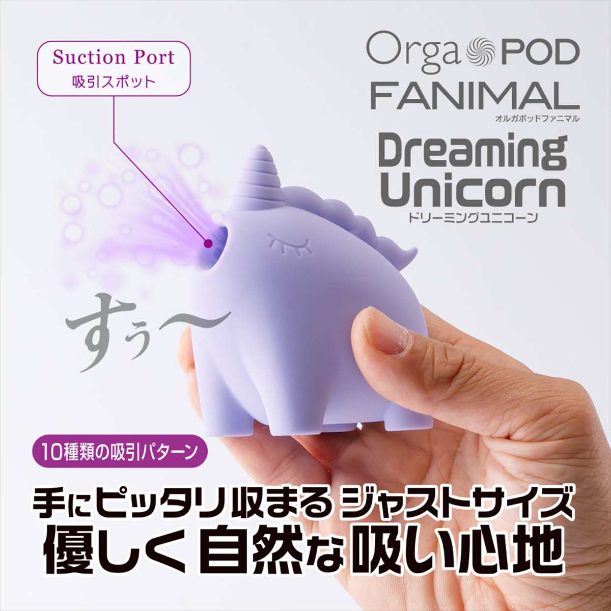 かわいいデザインと確かな吸引力で人気のオルガポッド・シリーズ。今度は可愛らしい動物タイプになって登場です。オルガポッドファニマルドリーミングユニコーンは可愛らしいユニコーン型の吸引ローターです。可愛らしいデザインですが、吸引力はパワフル。力強さと優しさを兼ね備えた吸引をお楽しみいただけます。全10パターンの振動パワー・振動パターンをお楽しみください。素材は肌に優しいシリコン製、つるっとした柔らかい感触をお楽しみいただけます。また60分の充電でおよそ90分の連続使用が可能です。IPX5相当の防水性能を完備しており、使用後は優しく洗い流すことも可能です(水の中に沈めることは、おやめください)。かわいらしいユニコーン型の吸引ローター。手にちょうど収まりやすいサイズで、魅惑の吸引体験をお楽しみください。