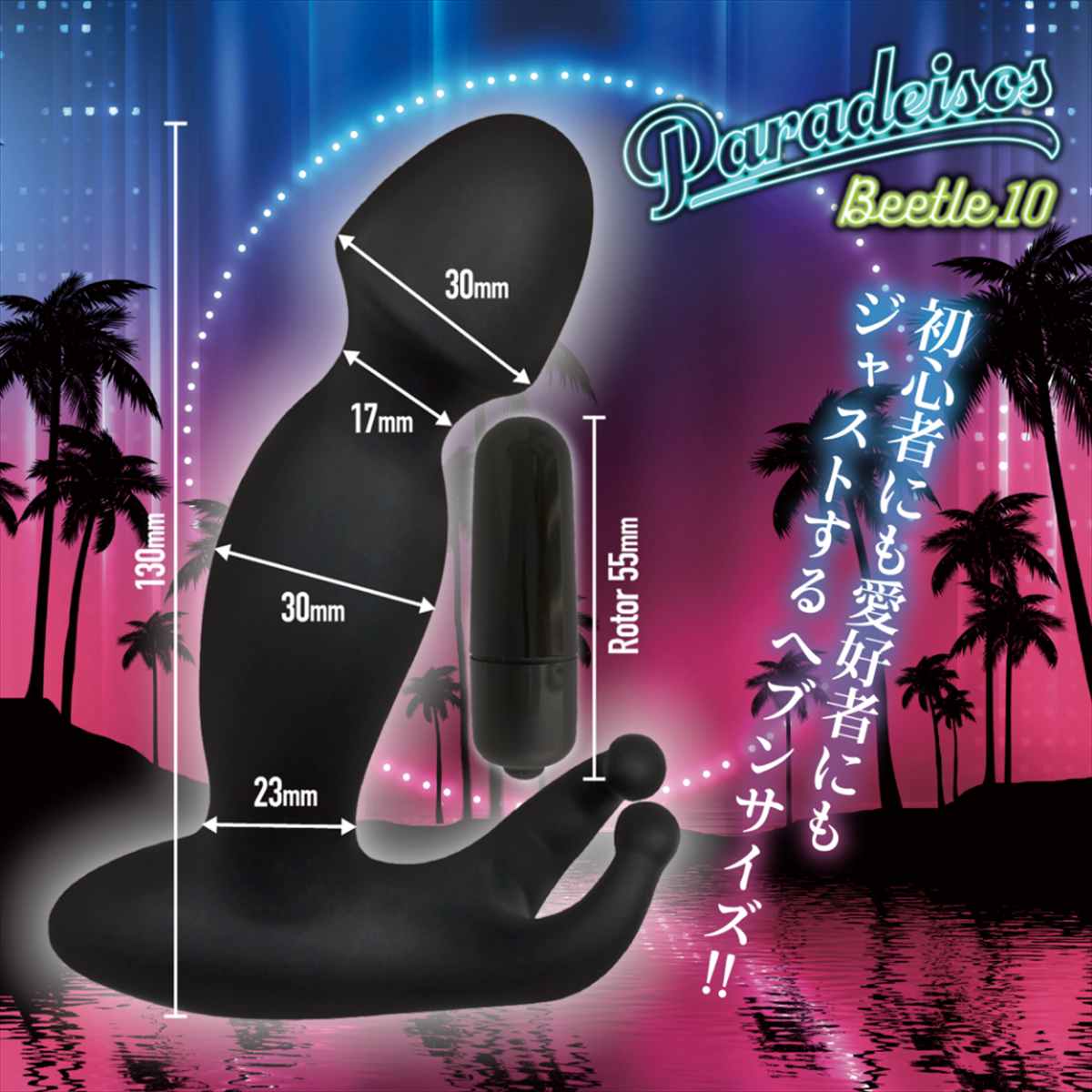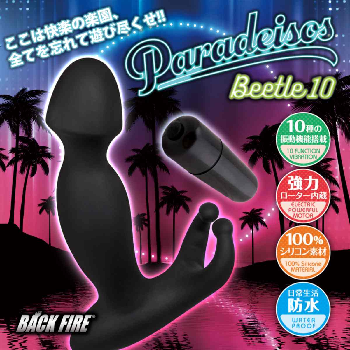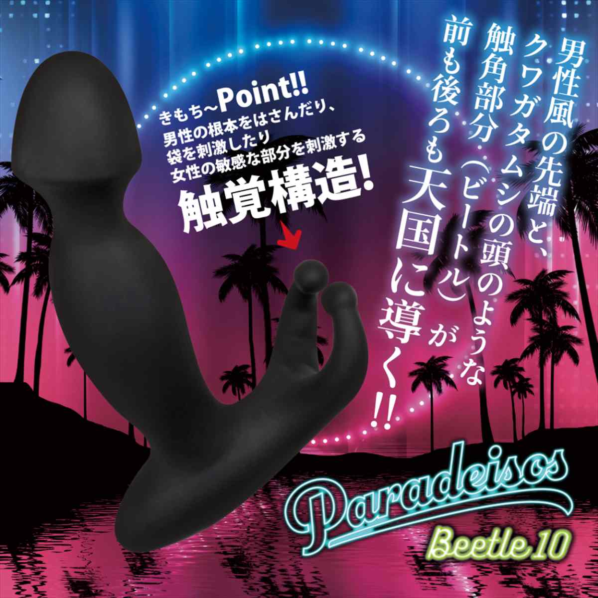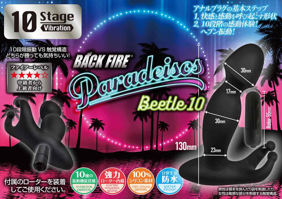 天国に導くシリーズ「パラディソス」で、その特徴的な形状で人気爆発し、欠品状態が続いてしまった「ビートル」が性能アップ、10function機能搭載、価格据え置きで帰ってきました!!その名「バックファイアーパラディソスビートル10」です。滑らかな肌ざわりの上質なシリコンを潤沢に使い、100%シリコン製で仕上げた、電動ディルドです。ビートル10は、男●器のような形状の先端と、クワガタムシの頭のような触角部分(ビートル)をもっています。男性が使用すれば、先端部は、グリグリと奥へ入り込み、ディルド全体が大きく振動し、驚きの天国体験を味わえます。女性が使用すれば、確実にGス●ットを刺激して、天国体験が味わえます。ビートル(触角)の部分は、男性が使用する場合は、リングのように装着でき、締め付けない仕様だから超微振動のゾクゾク体験を味わえます♪女性の場合は、ク●部分を微振動させ、ゾクゾク体験を味わえます♪