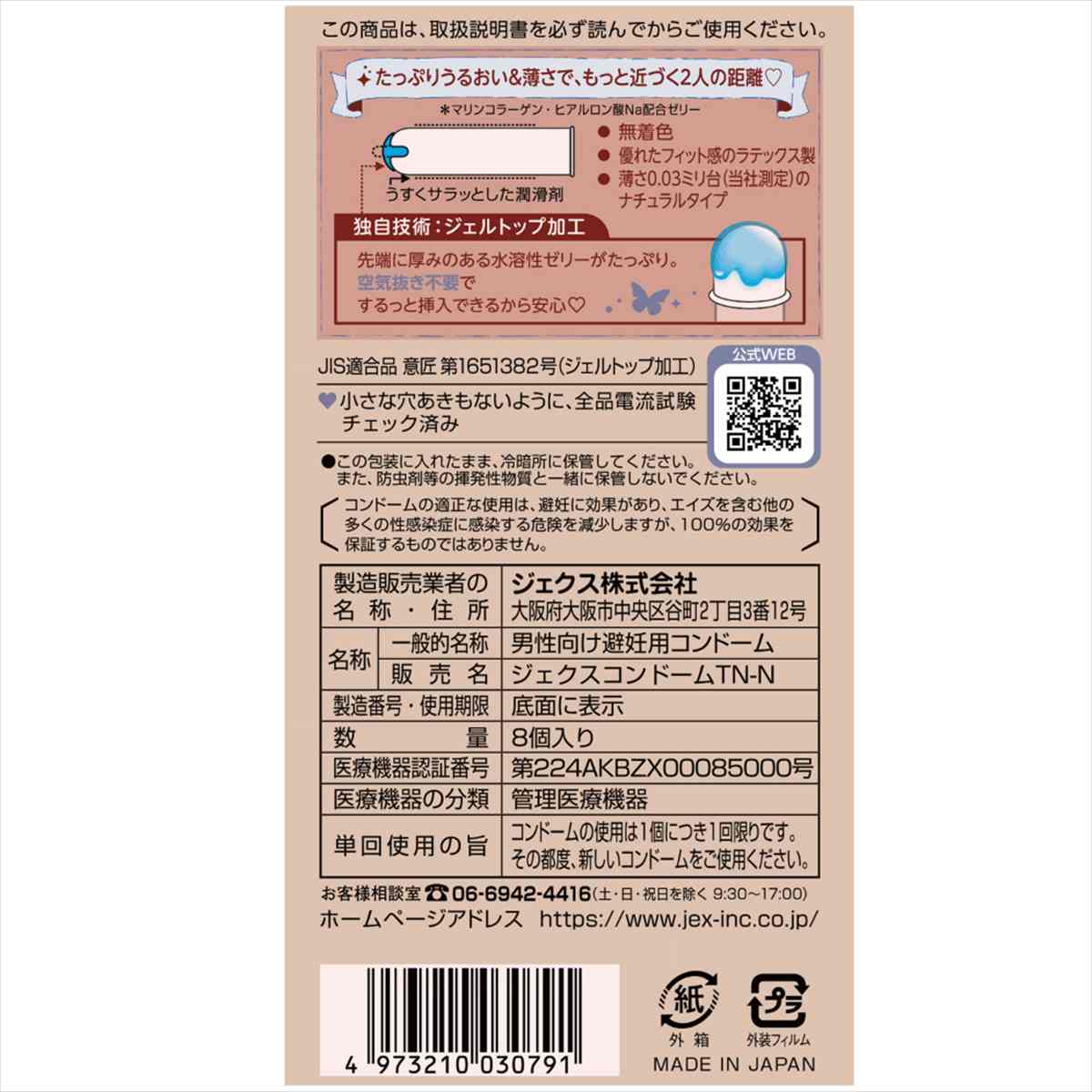 薄さ0.03ミリ台(当社測定)、マリンコラーゲン・ヒアルロン酸Na配合のモイストゼリー、女性側にやさしいジェルトップ加工、水溶性ゼリーたっぷりでなめらかな使用感、ナチュラルタイプ、無着色、8個入り。