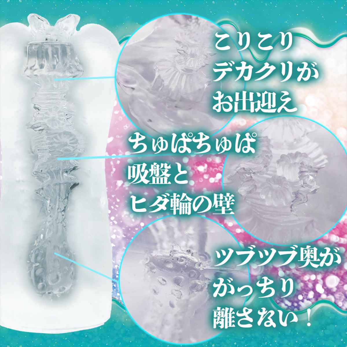とろけるゼリーのようなホールとギュッと締めるリングの快感満点セット!とろけるやわもちホールと感度爆上げのギュン締めリング、さらにたっぷり楽しめるローションが付属。オナ3娘吸いつきせまリングは、こりこりとしたデカク●とさらに進入していくと、ちゅぱちゅぱとした吸盤とヒダ輪の刺激。最奥のツブツブ子●が先端をガッチリと捉えてくれる。透明なホールは、射●の様子が丸見えで興奮間違いなし!指が埋まるほどの、超ぷにトロスライム素材がやわらかくって気持ちイイ!ホールだけでも、付属のリングを装着しても楽しめる欲張りホールです。
