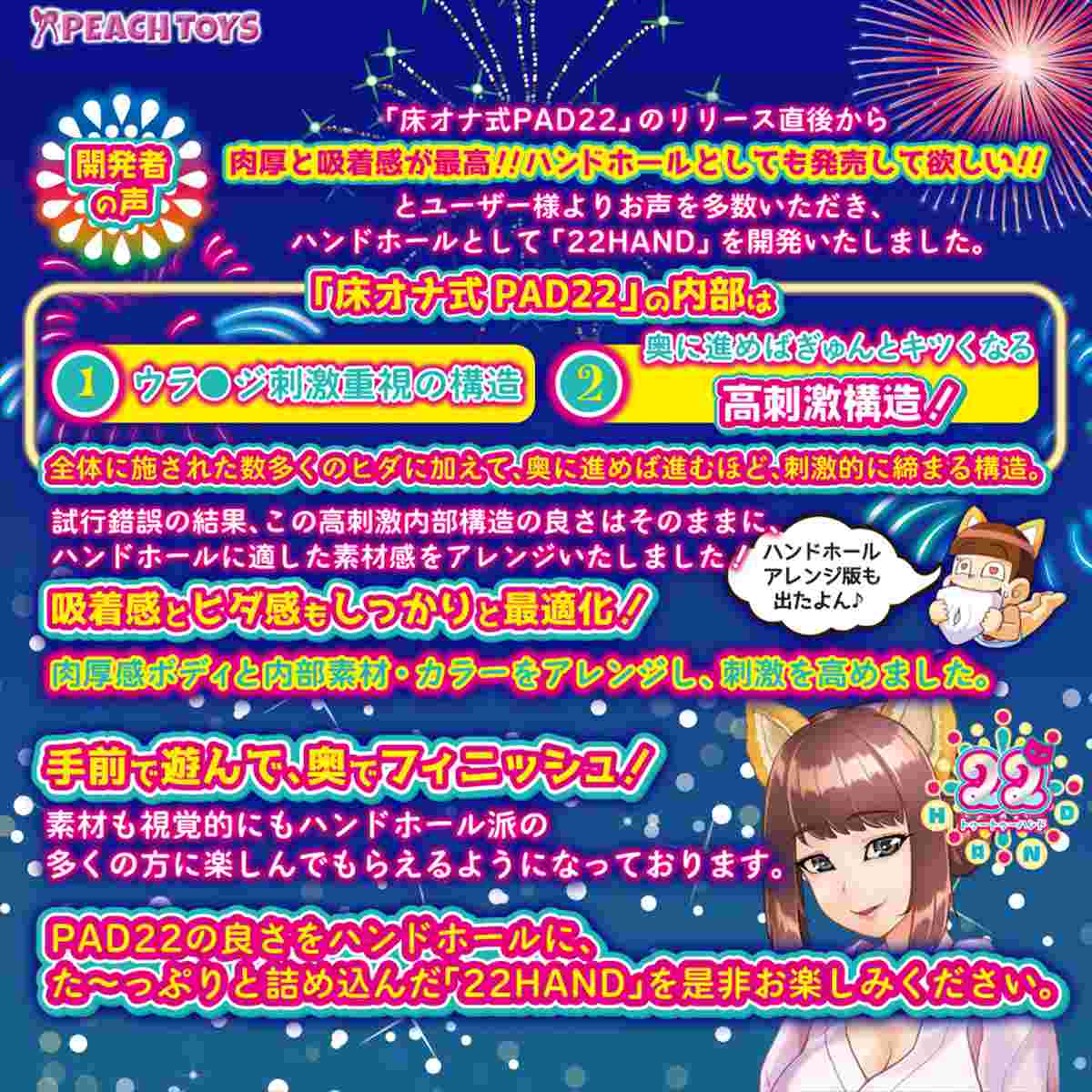 『HANDホールアレンジシリーズ』に新しく登場!「22HAND(トゥートゥーハンド)」「床オナ式PAD22」のリリース直後から「肉厚と吸着感が最高!!ハンドホールとしても発売して欲しい!」とユーザー様よりお声を多数いただき、ハンドホールとして「22HAND」を開発。「床オナ式PAD22」の内部は、ウラ●ジ刺激重視奥に進めばぎゅんとキツくなる高刺激構造!加えて奥に進めば進むほど、刺激的に締まる構造。この高刺激内部構造の良さはそのままに、ハンドホールに適した素材感をアレンジ!吸着感とヒダ感もしっかりと最適化!肉厚感ボディと内部素材・カラーをアレンジし、刺激をアップ。「手前で遊んで、奥でフィニッシュ!」素材も視覚的にもハンドホール派の多くの方に楽しんでもらえるようになっております。PAD22の良さをハンドホールに、た〜っぷりと詰め込んだ「22HAND」を是非お楽しみください。