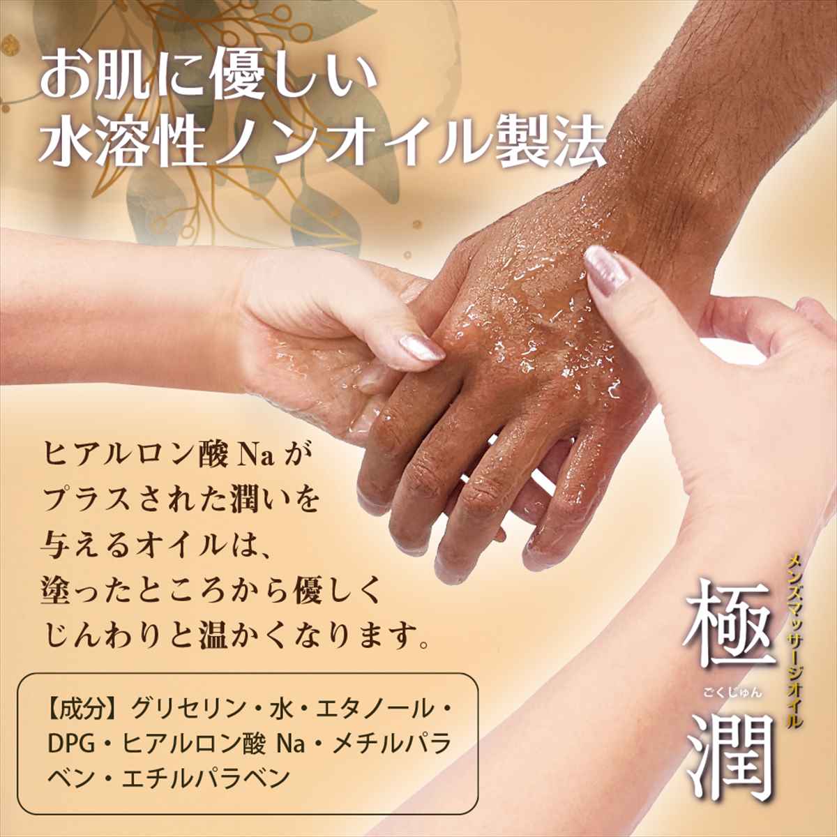 極上のマッサージタイムを演出するには極上のマッサージオイルを。「潤い」、「滑らかさ」、さらに「使いやすさ」を追い求めて完成したマッサージオイルがこの『極潤』です。熱伝導に優れた温感タイプなので、塗った瞬間からじんわり温かく感じます。寒い冬場でも冷たさを感じません。心も体もじんわりと温めてくれます。水溶性のマッサージオイルなので、使用後は水で洗い流すか濡れたタオルで拭き取ってください。温かいタオルで拭き取ると気持ちよく拭き取れます。また、無香料なので使用後に匂いも残りません。※成分上舐めると甘く感じますが飲み物ではございません。大量に飲み込まないようにご注意ください。大変滑りやすいので足元にこぼさぬようご注意ください。