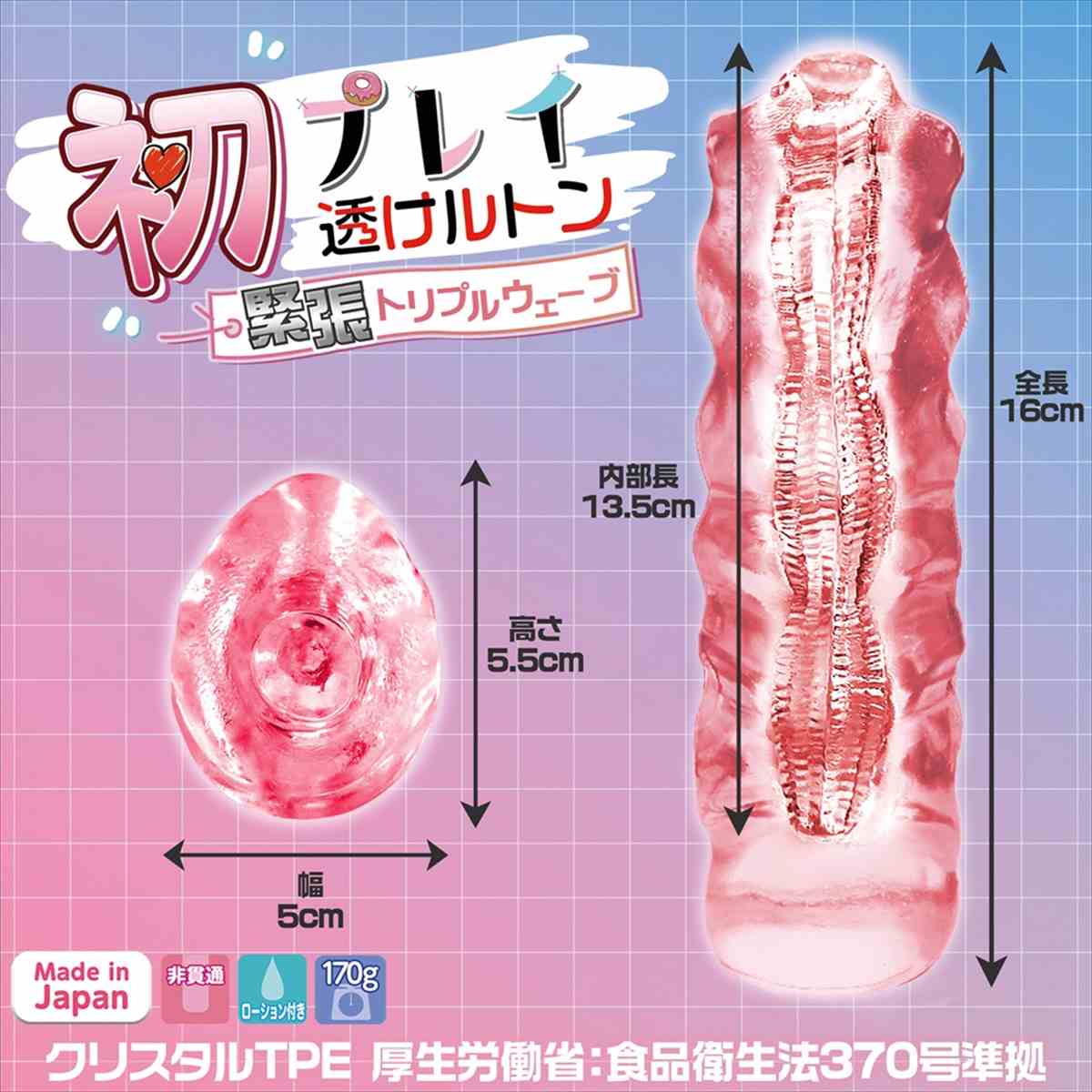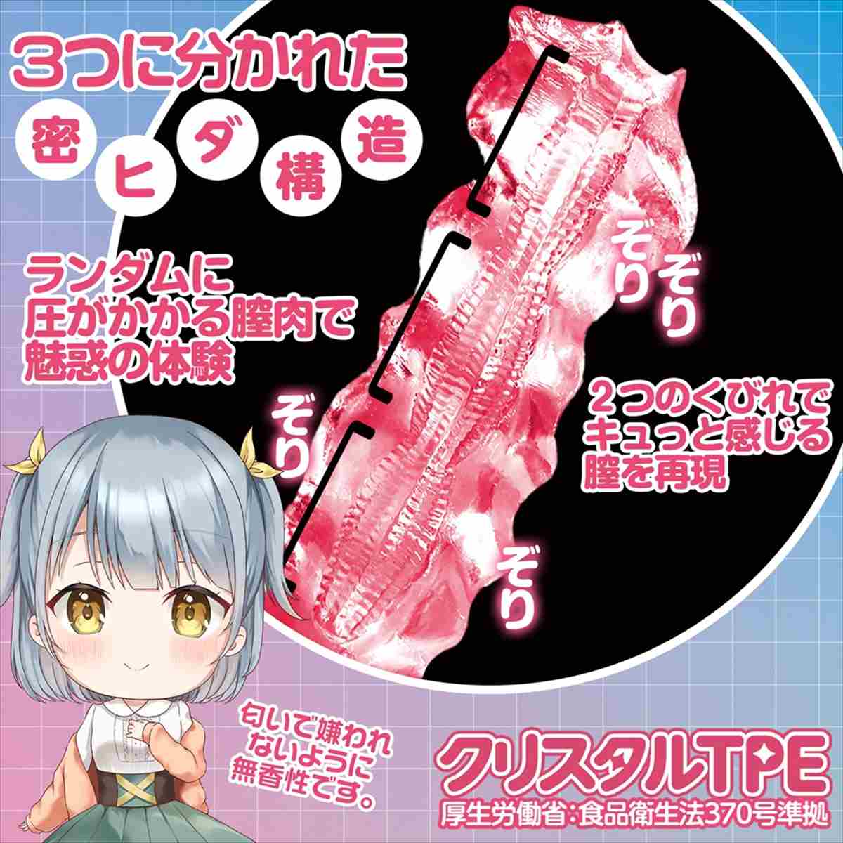 緊張して体に力が入ってしまう―――そんな自然なかたさ”を再現。大人気「もちっ娘透けルトン生感トリプル・トゥーループ」の内部構造はそのままに初めての”かたさ”を再現。六角形で作られた星型の内部構造は大きく3ブロックに分かれており、進む度にランダムな圧が波を打つ。緊張しているかのような”かたさ”×3連の波は何度でも試したくなる魅力があります。クリアピンクボディの見た目は美しさはもちろん、視認できるからとってもえちえち。素材は日本製の「クリスタルTPE」(厚生労働省:食品衛生法370号準拠素材使用)を採用していますので安心してご使用頂けます。パッケージイラスト:カネコメメ太先生”