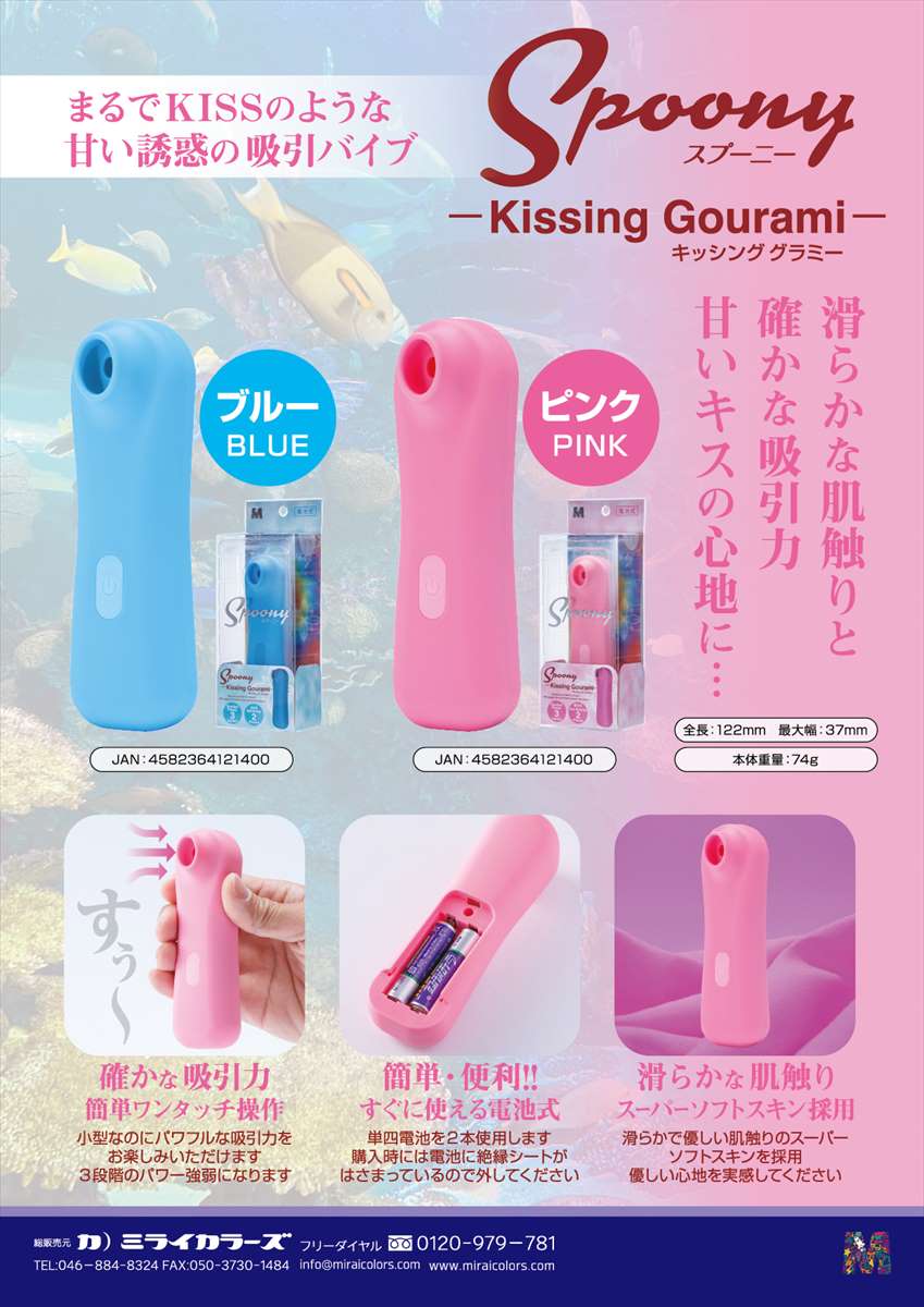 滑らかでサラッとしたスーパーソフトスキンボディです。肌に馴染みが良く、安心してお使いいただけます。操作は誰でも手軽に扱えるワンボタン式を採用。長押しで吸引がスタート、短押しでパワーの強弱が三段階で変化します。小型ですが、確かな吸引力を発揮します。簡単にすぐ扱える電池式(単四電池2本使用)を採用。購入時には絶縁シートが挟まっているので、それを取り外せばすぐに使用できます。女性への優しさが詰まったスプーニーキッシンググラミー。まるでキスの様な優しい心地をお楽しみください。