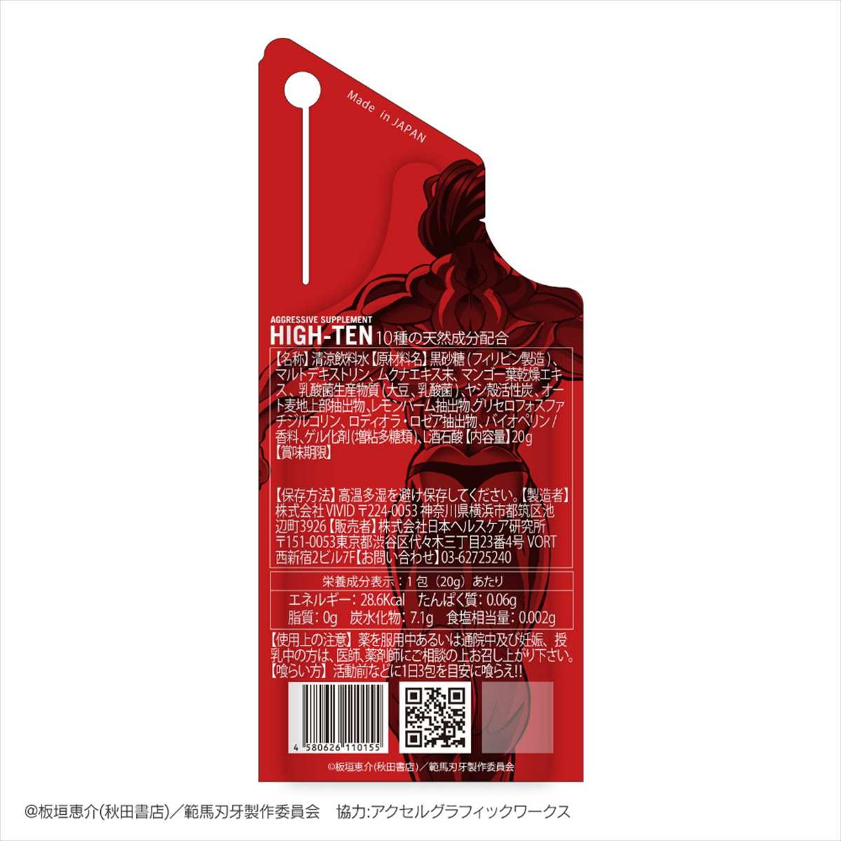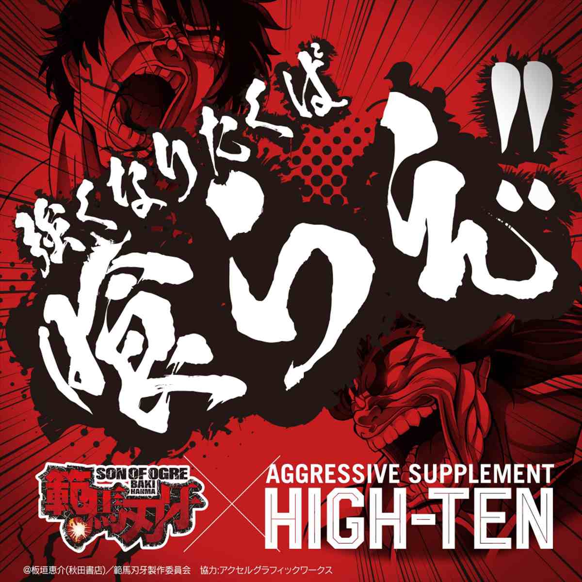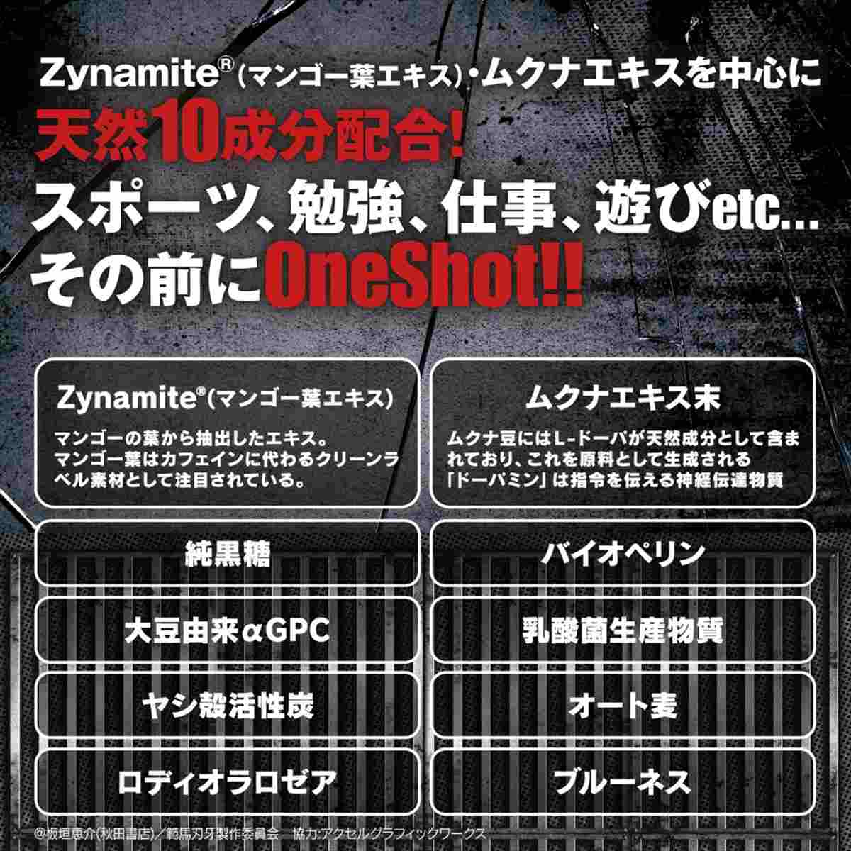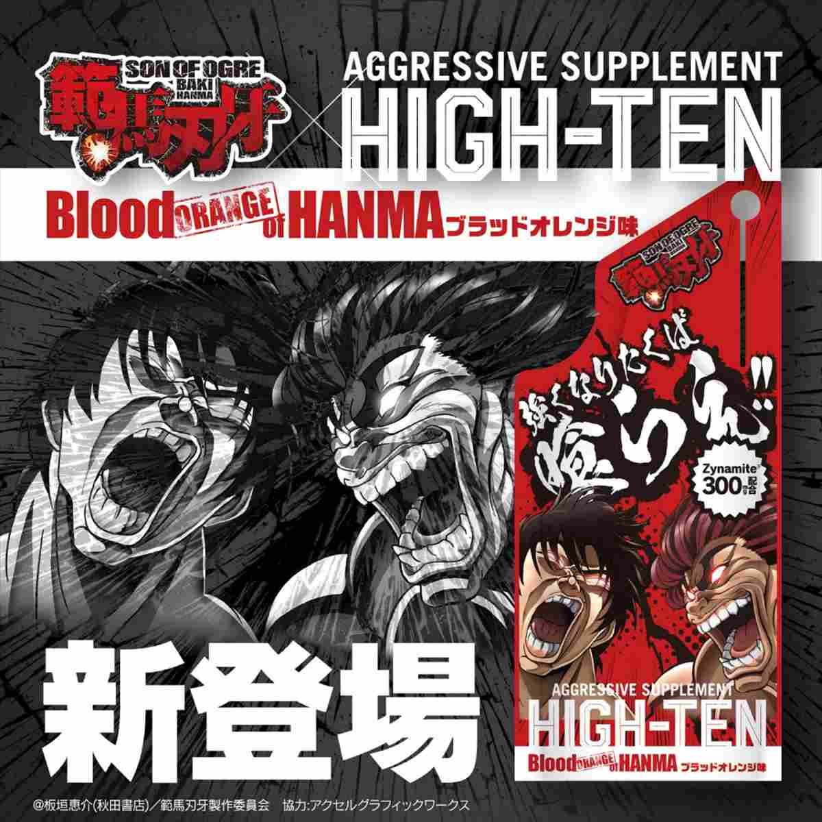 アグレッシブサプリメントHIGHTENが超人気格闘アニメ「範馬刃牙」とハイパーコラボ!カフェインに替わるクリーンラベル素材「ザイナマイト」300mg!!L-ドーパをたっぷり含んだ「ムクナエキス」150mg配合!!!さらに天然8成分が強力にサポート!スポーツ、仕事、勉強、遊び、パートナーとの二人の時間の前にONESHOT!!合言葉は「強くなりたくば喰らえ!!」新たなZONEを体験してください!