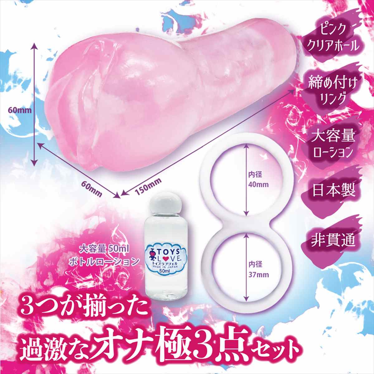 ねっとり絡みつくピンクのクリアホールと感度爆上げの締め付けリング、さらに溢れる愛液のような大量ローションが付属。3つが揃った過激なオナ極みセット。リングは射精感爆発のダブルリング。柔軟なシリコン製でフィット感抜群。ランダムヒダが連なるぞりぞりロードが興奮を誘うピンククリアホール。愛液のようなローションはたっぷり50ml。ホールだけでも、付属のリングを装着しても楽しめる欲張りセットです。