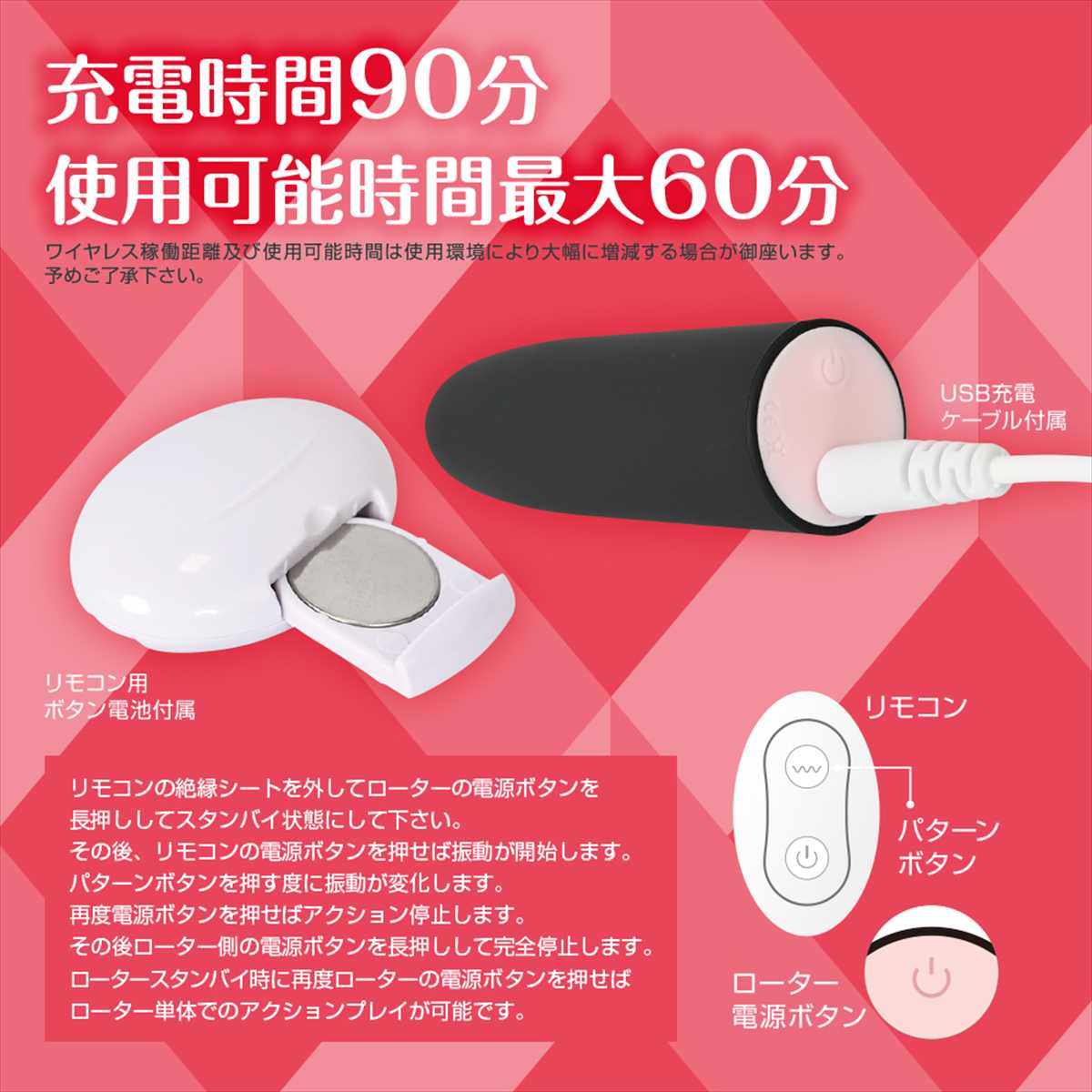 『完全防水×ワイヤレス』でプレイの幅がグッと広がる!防水等級IPX7仕様にバレット形状のスマートローター。ワイヤレス稼働距離10mで遠隔プレイが楽しめます。圧倒的なハイパワー振動モーターを動かす充電式のリチウムイオンバッテリー搭載。90分の充電で約60分使用可能。(※使用環境により大幅に増減します)ローターもリモコンもコンパクトだから持ち歩きも便利です。