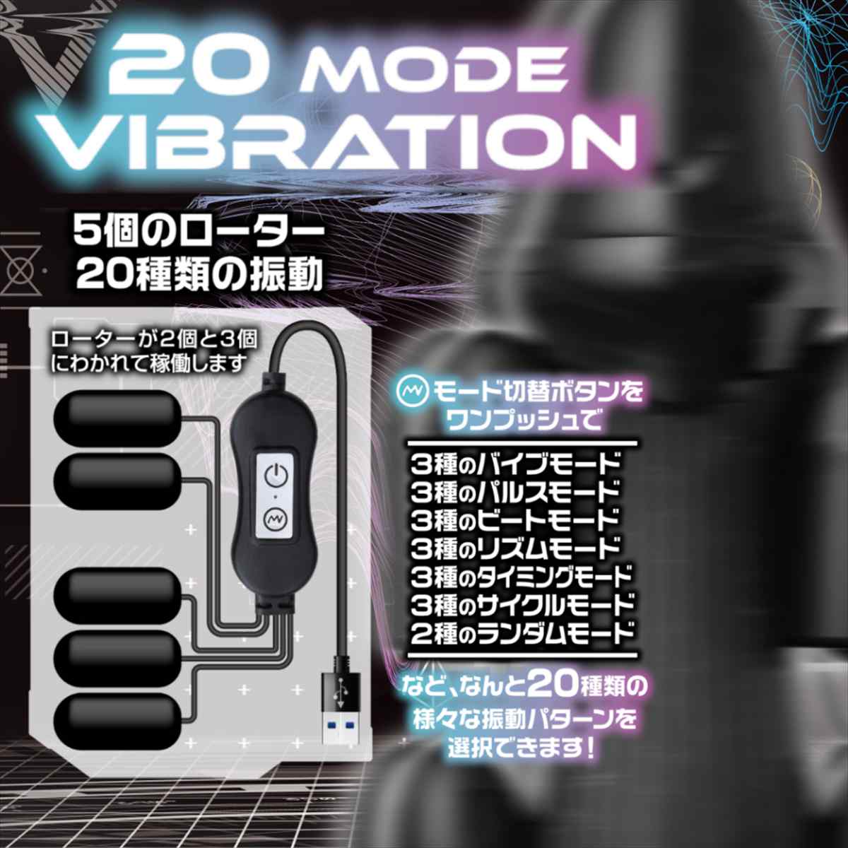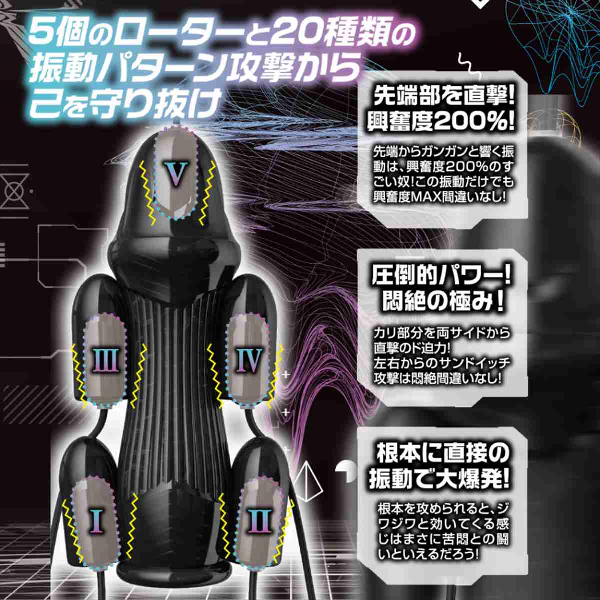 「新時代の破壊力を体感せよ!」先端部直撃ユニットは、まさに圧倒的なパワーを誇ります。その衝撃は、あなたを悶絶させること間違いなしです。根本に直接振動を与えることで、驚異的な大爆発を誘発します。その驚異的なパワーは、あらゆる障害物を突破し、絶対的な破壊力を発揮します。どんなに元気がない時でも爆発へと導きます。このバイブレーションブラスター5があれば、あなたを鍛え、快感に導き、進化した未来を切り拓くことができるでしょう。テクノロジーと革新的なデザインが融合したこのバイブレーションブラスター5は、使いやすさと操作性にも徹底的にこだわりました。初めての方でも簡単に扱える2ボタンの簡単操作です。さあ、この圧倒的なパワーを手に入れましょう。未体験の世界があなたを待っています。バイブレーションブラスター5はがあなたの可能性を解き放ち、新たな領域へと導くことでしょう。5個のローターと20種類の振動パターン攻撃から己を守り抜け!
