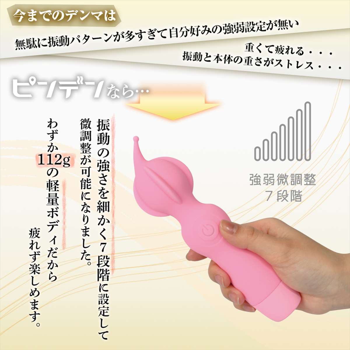 ピンポイントヘッド・ヒダ突起付の完全防水シリコンデンマです。<>上質振動の強力モーター搭載・高品質シリコンボディ・フレキシブルネックの上級性能に加えてピンポイントを強力刺激出来る先端突起と割れ目に入れて楽しめるヒダ突起形状をプラスしました。<>振動も一般的なパターン振動では無く、こだわりの強弱微調整可能な7段階振動です。<>もちろん普通のデンマスタイルも可能なので色々な楽しみ方が出来ます。<>しかもIPX7の完全防水性能だから使い勝手もバツグンです。<>90分満充電で60分使用可能(※使用環境により大幅に増減します)なリチウムイオン電池内蔵。<>パワフルなのに繊細な使い方も楽しめるデンマです。
