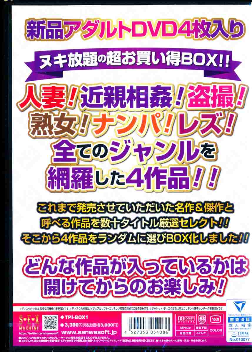 新品アダルトDVD4枚入り ヌキ放題の超お買い得BOX!! 人妻!近親相姦!盗撮!熟女!ナンパ!レズ!全てのジャンルを網羅した4作品!! これまで発売させていただいた名作&傑作と呼べる作品を数十タイトル厳選セレクト!!そこから4作品をランダムに選びBOX化しました!! どんな作品が入っているかは開けてからのお楽しみ!!審査番号285900。