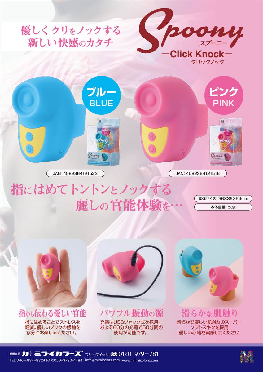 このスプーニークリックノックは優しくク〇をノックする小型ローターです。指にはめて使用するので、持つ必要がなくストレスなく遊ぶことができます。またとても滑らかな素材を使用し、肌心地は抜群。優しい感触の官能体験をご堪能いただけます。操作は簡単。まず電源スイッチを長押しで起動。起動後は電源スイッチを短押しで振動パターンが7種類、Mスイッチを短押しで振動パワーが3段階、変化します。充電は付属のケーブルを使用します。およそ60分の充電で、最大50分の使用が可能です。優しくク〇をノックするスプーニークリックノック。トントンと刺激する官能をお楽しみください。