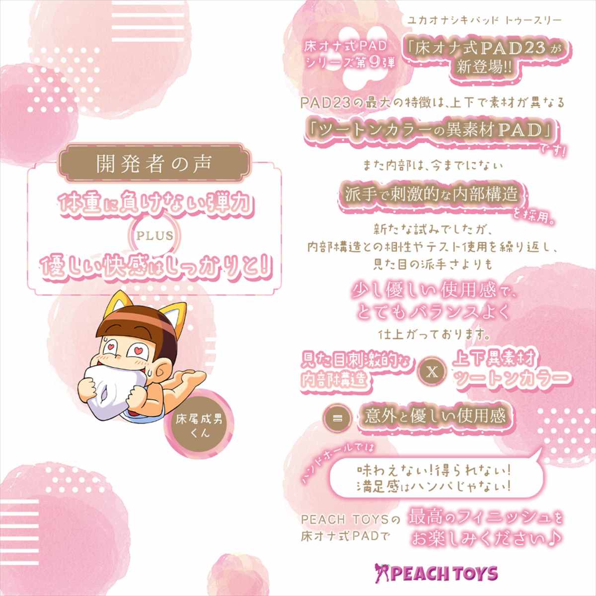 体重に負けない弾力PLUS優しい快感はしっかりと!床オナ式PADシリーズ第9弾「床オナ式PAD23(ユカオナシキパッドトゥースリー)」が新登場!PAD23の最大の特徴は、上下で素材が異なる「ツートンカラーの異素材PAD」です!また内部は、今までにない派手で刺激的な内部構造を採用。ヒダをメインとした立体的な突起構造で、前半は三角形状の突起、後半はブロック形状の突起が配置されています。新たな試みでしたが、内部構造との相性やテスト使用を繰り返し、見た目の派手さよりも少し優しい使用感で、とてもバランスよく仕上がっております。見た目刺激的な内部構造×上下異素材ツートンカラー=意外と優しい使用感ハンドホールでは味わえない!得られない!満足感はハンパじゃない!PEACHTOYSの床オナ式PADで最高のフィニッシュをお楽しみください♪