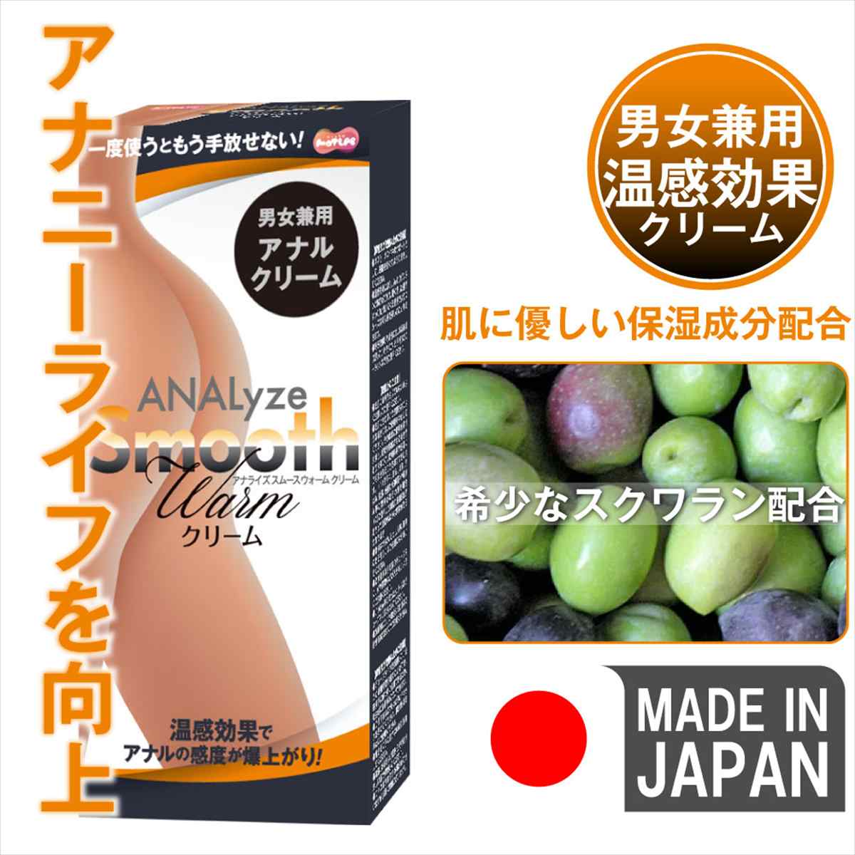 温感でア〇ルプレイ時の感度をサポートし、高い保湿性・潤滑性でデリケートな部分をプロテクト。ア〇ルプレイ時の感度アップのサポートと摩擦刺激からの保護を両立したア〇ル用クリームです。塗付した箇所にほんのり温かみが感じられ、デリケートな部分を優しくほぐすことで快感を際立たせます。またスクワラン・セタノール等の保湿成分が摩擦を軽減し、ダメージを防ぎます。お腹にも優しいグリセリン不使用タイプ。男女兼用ですので、シングルプレイ・カップルプレイ等、ア〇ルプレイを愛する全ての方へオススメできます。