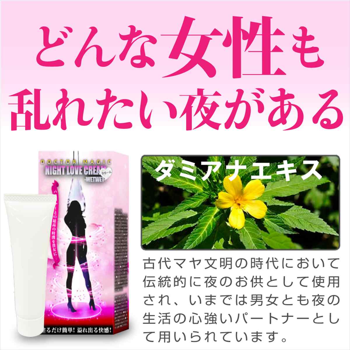 大切な夜を鮮やかに彩る。感度を向上させ、気分を盛り上げる成分を配合した媚〇クリーム。感度を高め気分を盛り上げる女性用媚〇クリーム。古より使用されている、性欲増・催淫作用のあるダミアナエキスをはじめ、肌の潤いや保湿等に期待の持てる成分を多数配合。感度を上げたい部位にマッサージの要領で優しく擦り込むだけで快感アップ。いつもより燃え上がる夜にしたい時にお試しください。周囲やパートナーにもバレにくいシンプルパッケージなので安心して持ち歩けます。