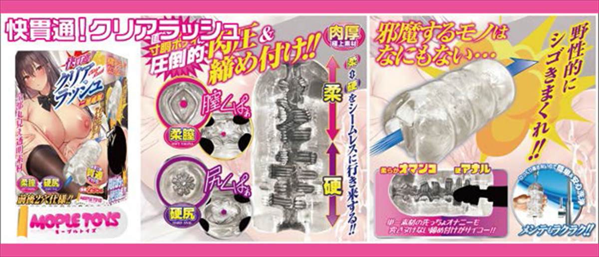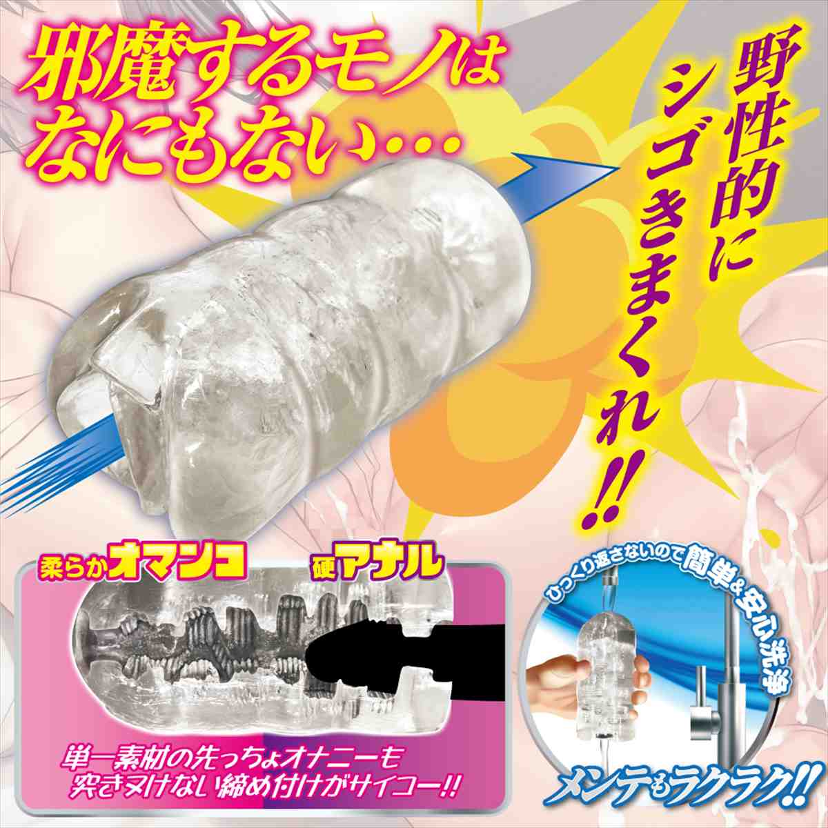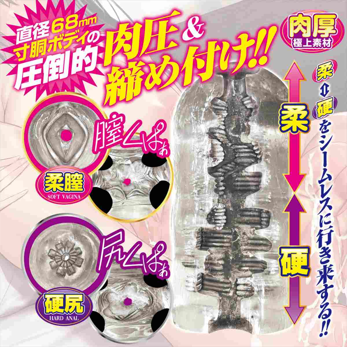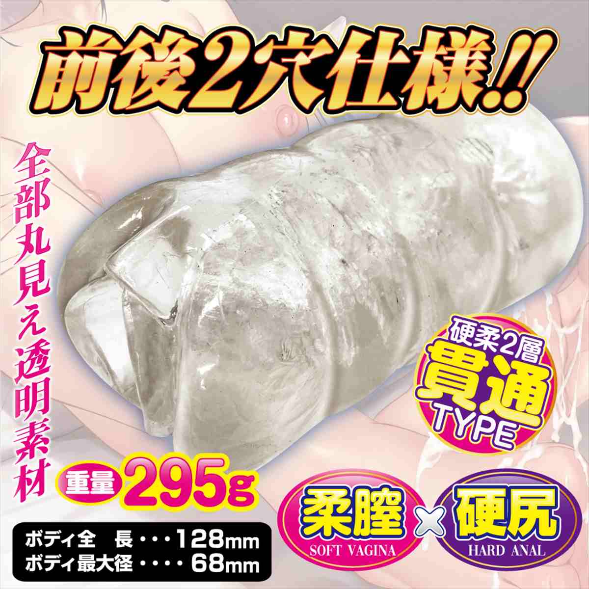 肉厚透明素材がググっと締め付ける!ソフト素材とハード素材のシームレス貫通ホール。中まですけすけのクリア素材を採用した丸見え貫通ホール。ヴ〇ギナ側の入口はソフト素材、ア〇ル側の入口はハード素材を使用し、シームレスな硬さの変化を楽しめます。内部構造はヒダや突起を複雑に配置。四方八方から締め付けとゾリゾリ刺激を生み出します。寸胴ボディなので肉厚感を存分に楽しめるとともに、貫通型ならではの開放感と先端刺激も味わえる贅沢仕様のホールです。