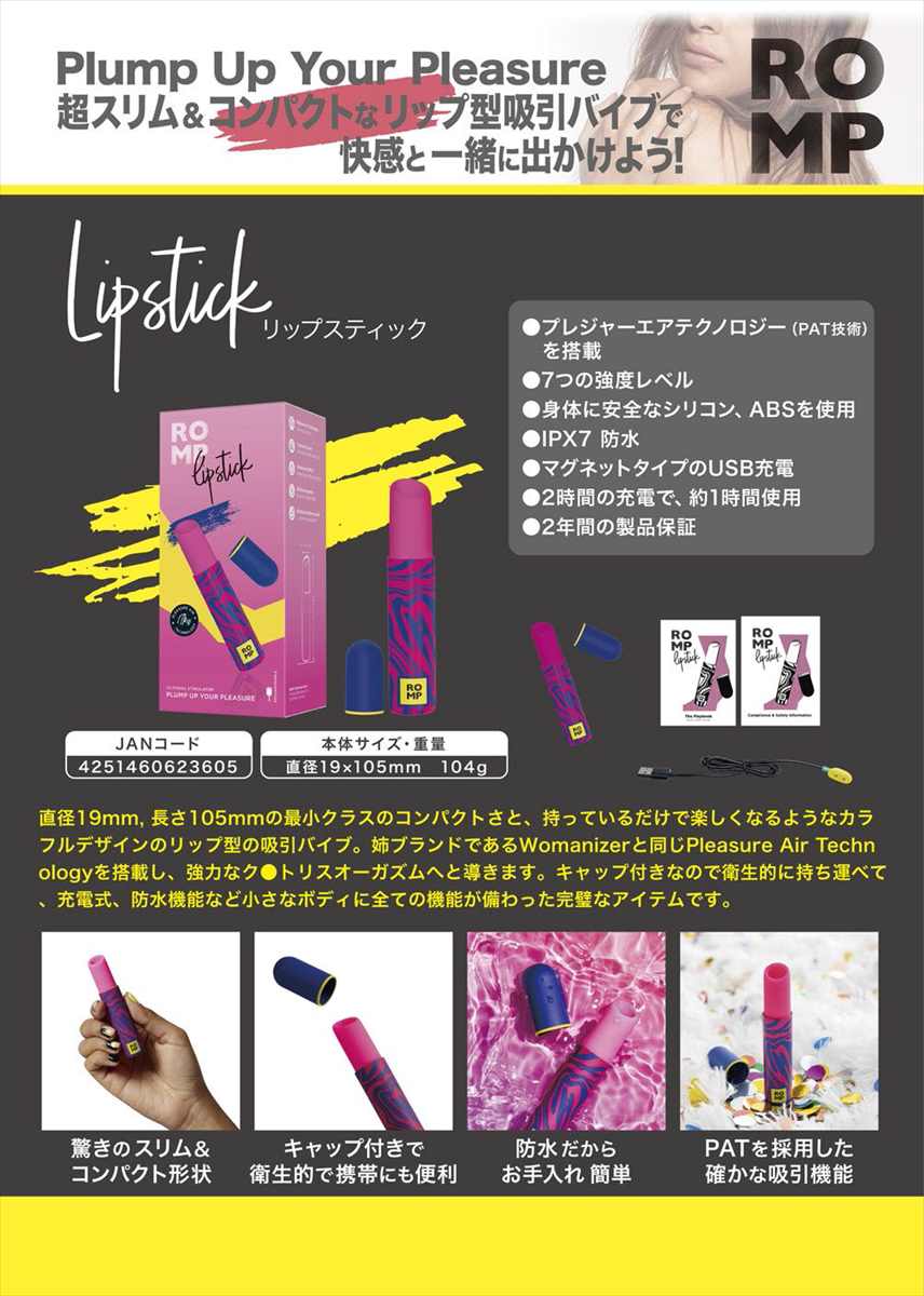 超スリム&コンパクトなリップ型吸引バイブで快感と一緒に出かけよう!ROMPLipstickは、直径19mm,長さ105mmの最小クラスのコンパクトさと、持っているだけで楽しくなるようなカラフルデザインのリップ型の吸引バイブ。姉ブランドであるWomanizerと同PleasureAirTechnologyを搭載し、強力なク〇トリスオーガズムへと導きます。キャップ付きなので衛生的に持ち運べて、充電式、防水機能など小さなボディに全ての機能が備わった完璧なアイテムです。