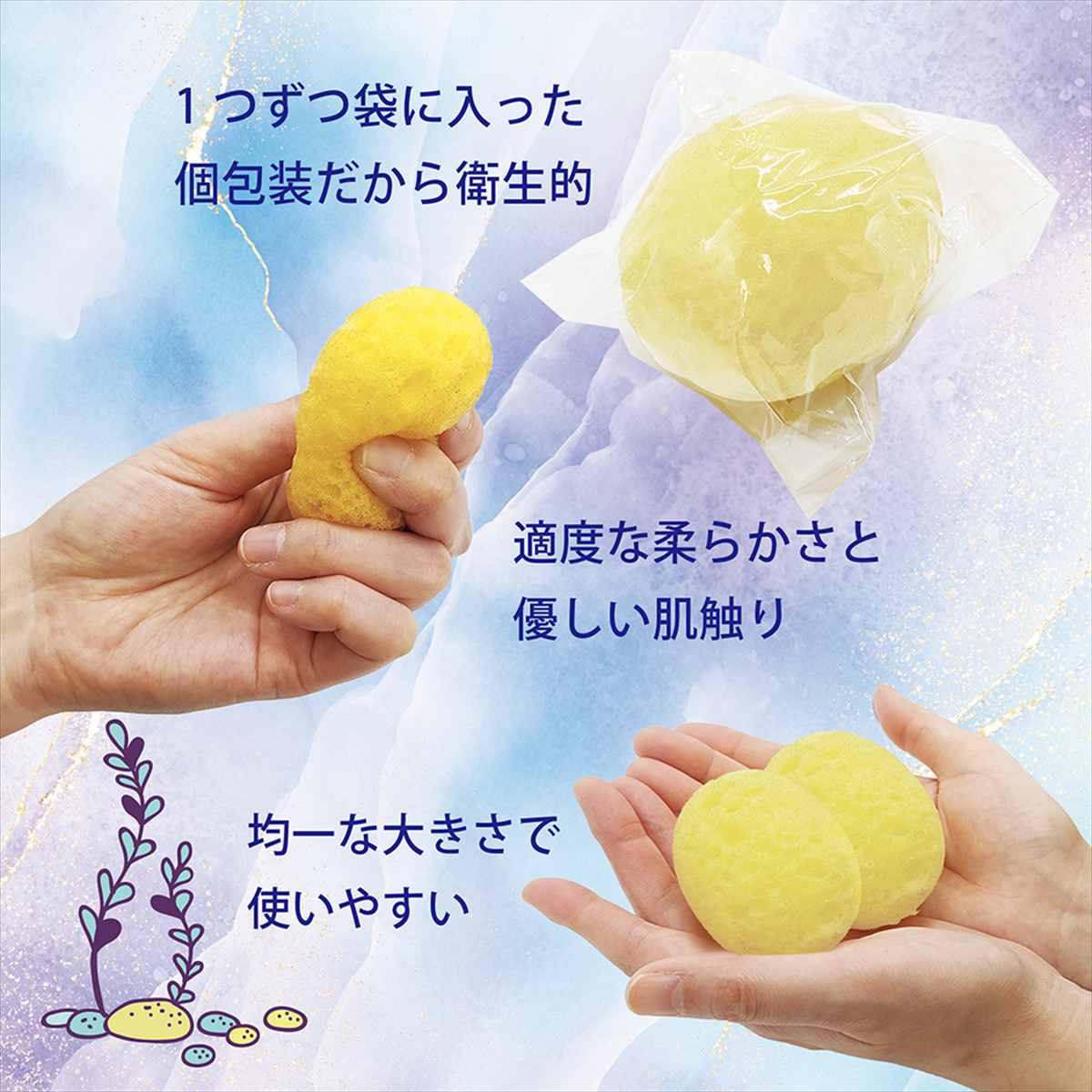 天然海綿を模して成型した、吸水性の高い人工海綿です。個包装で衛生的、業務用としてもお求めやすいお得なおまとめ10個パックをご用意いたしました。大きさは大粒で、形も均一なのが特徴です。大中小の不揃いの気泡を作ることで吸水性を高め、優しい肌触りに仕上げました。海から採れる天然の海綿と違い、貝殻や海草、微生物などの不純物もなく安心して清潔にお使いいただけます。長さ約7cm、直径5cm。急なあの日でも安心、お好みのサイズにハサミでカットして使え経済的です。