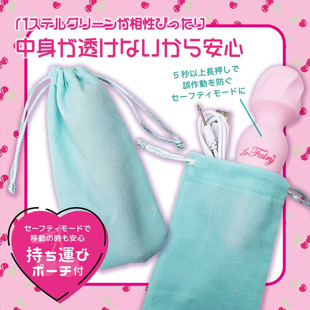 手のひらサイズで持ち運びにちょうどいい!カジュアルなハイパワーデンマ「ラ・フェアリーチェルシー」カワイイだけじゃない!高性能モーター内臓でしっかり強い振動の7,500rpmを実現!3段階の強弱に加えリズム振動をプラスした4種類の振動が選べます。完全防水IPX7を取得し、充電式なのでお風呂でも手軽に使用可能。繋ぎ目のない高級シリコン製なので静音性に優れ見た目も美しく、丸洗いできお手入れも簡単。シリコンのすべすべとした優しい肌触りで身体も心も癒されます。ヘッドの波々形状が、ビンカン部分もロックオン!中身の透けないポーチ付属、ご使用後充電コードとまとめてすっきり収納。持ち運びにも便利!セーフティーモード機能により、バックなどに入れて持ち運ぶ際の誤作動も防ぐことができます。サクランボをデザインしたクリアケースパッケージで、さらに可愛さ倍増