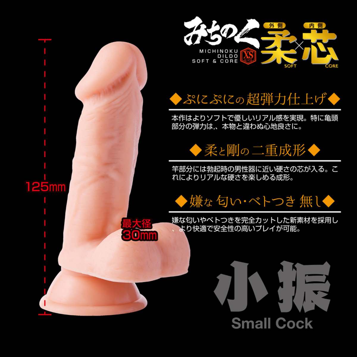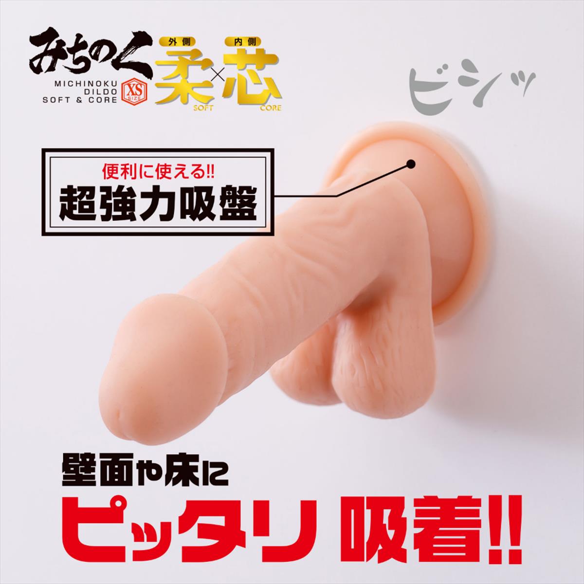 世界中で売れ続けている大人気ディルド・みちのくシリーズ。人気の柔芯シリーズに新たなラインナップが登場です。このみちのくディルド柔×芯”の最大の特徴は「外は柔らかく、中は硬い」二重構造です。今までとは異なる技術製法を駆使し、本物さながらの触り心地を実現しました。これにより外側(特にキトー部分)はプニプニっとしたリアルな柔らかさを実現、リアル感溢れる弾力を手に入れました。また内側はまるで海〇体に血が通ったかの様な硬さの素材を使用、リアル過ぎる感触をお楽しみいただけます。今までのみちのくシリーズを超越した至極の使用感は、ディルドを愛する方にぜひ使っていただきたいと思います。このXSサイズはやや小振りなサイズ感、それでもしっかりとツボを押さえた一本です。また今までのシリーズ同様に強力な吸盤は健在。壁面や床など、プレイに合わせた使い方でお楽しみいただけます。”
