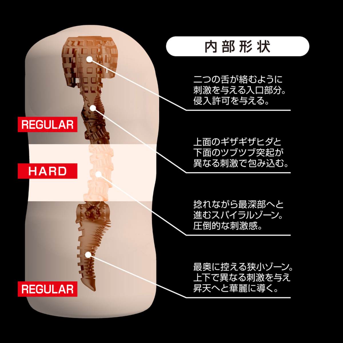 全方位フェチをうたう男性向けブランド「360°FETISH」。快感の感度を高める、柔・硬・柔の三層構造を実現した「堕悦-DAETSU-」の登場です。この堕悦は硬度の異なる二つの素材を三層に配置し、柔・硬・柔の挿入感を実現しました。絹の様な柔らかい感触と、しっかりと刺激を与えるハードな感触が交互に訪れます。また内部構造は二つの舌が絡みつく入り口部分。上下で異なる感触面を通過し、捻れるヒダを通過する中間部。狭小の壁面でしっかりと包み込む最奥部。これらは快感を高めるために考えられた構造になっています。また本品は匂いの少ない素材を使用した純国産です。このホールのために考えられた新素材・KRスキンを採用し、純度の高い快感を提供すること可能になりました。堕ちゆくは悦柔く剛く、蹂躙の螺旋階段。すべてのフェチ心を持つ男性に贈ります。