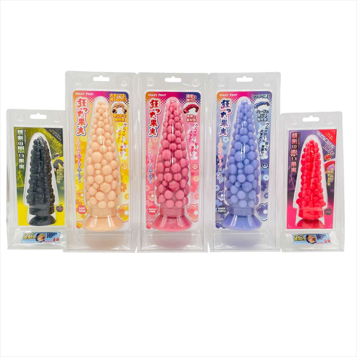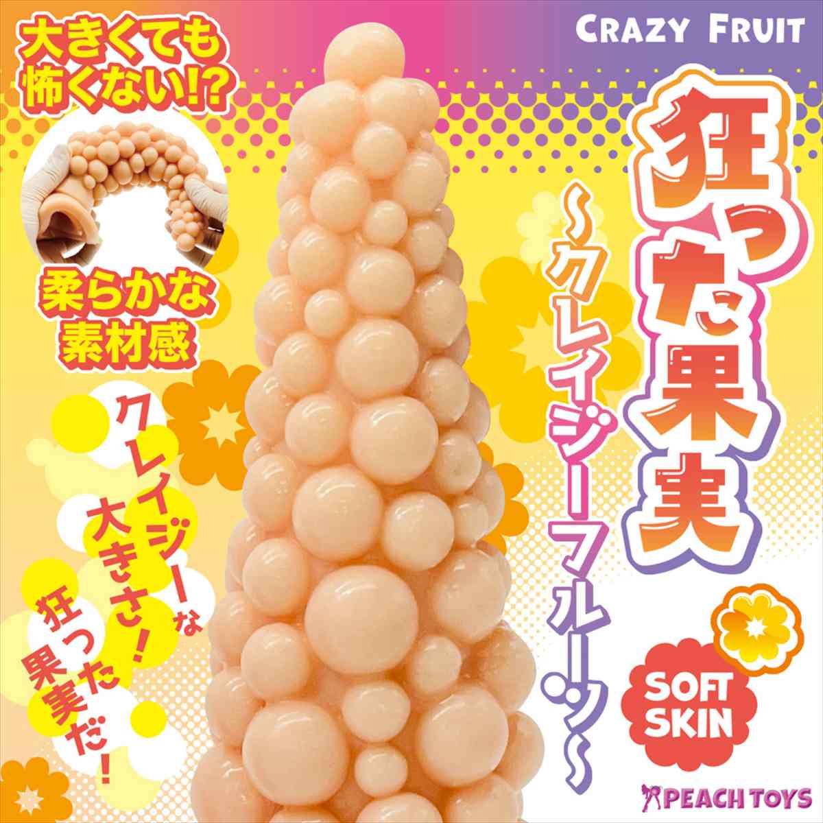 クレイジーな大きさ!狂った果実だ!『狂った果実〜クレイジーフルーツ〜』の登場です。●異なる大きさの粒々が刺激!全長27の巨大ディルド。先端は小さく、段々と広がる円錐形状に大きさの異なる粒々がランダムに配置!(直径0.6〜2.4の半球を多数配置)●カラーと硬さが選べる3タイプ!【ソフトスキン】肌色のソフトタイプ。大きくても怖くない!?柔らかな素材感!【スタンダードピンク】ピンクのスタンダードタイプ。適度な弾力と柔軟な素材感!【ハードパープル】パープルのハードタイプ。しっかり硬くハードに感じる素材感!●吸盤付きで多彩なプレイ!●一体式の強力吸盤!●材質:PVC●MADEINJAPAN