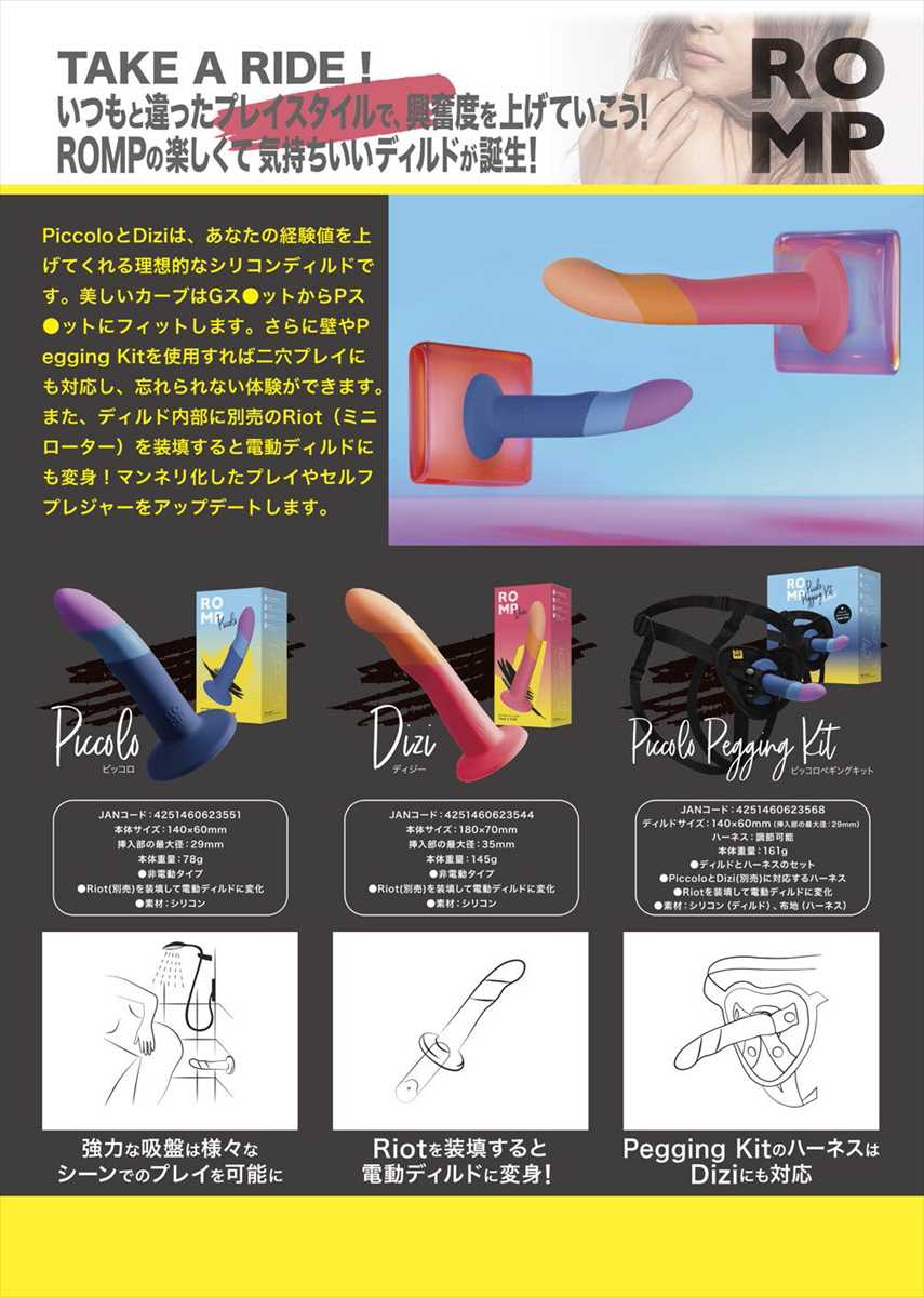 ひとりでも、ふたりでもディルドを楽しみたい方のために。ROMPのロゴ入りハーネスがついてくるセットをご用意いたしました!Piccolo(ピッコロ)は、あなたの経験値を上げてくれる理想的なシリコンディルドです。美しいカーブはGス〇ットからPス〇ットにフィットします。また、ディルド内部に別売のRiot(ミニローター)を装填すると電動ディルドにも変身!
