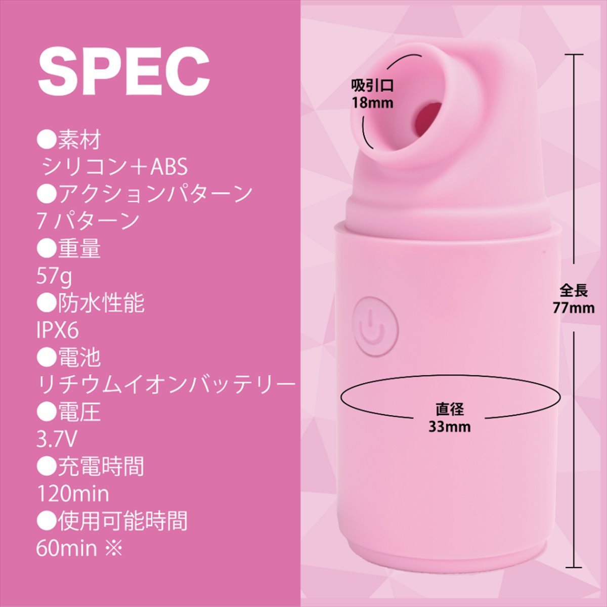 スタイリッシュな見た目で蓋付きだから持ち歩きにも便利な吸引ローター。<>上質なモーター搭載の吸引機構に高品質シリコン素材の吸引口と持ちやすいサイズ、さらにはIPX6の高レベル防水性能だからしっかり洗えて衛生的です。<>使用時は蓋を外して底面に付けられます。どこでもキャリー出来る自分だけのプレジャーアイテムです。<>3.7Vリチウムイオンバッテリー搭載で120分で満充電、最大60分の連続使用が可能です。(※使用環境により大幅に増減します。)<>多彩で実用的な7パターンの吸引を演出します。<>見た目と実用性を兼ね備えたMYPLEASUREGOODSです。