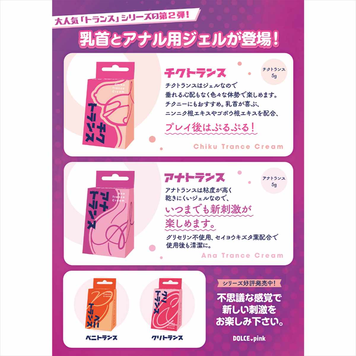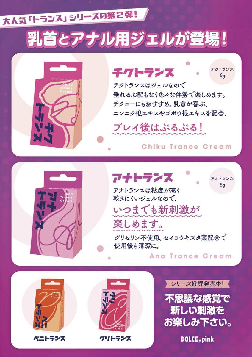 ●ジェルを塗ってビンカンに!新感覚で乳首フル〇ッキ!●大人気「トランス」シリーズの新商品●ジェルなので垂れる心配もなく色々な体勢で楽しめます●チクニーにもおすすめ●乳首が喜ぶニンニク根エキスやゴボウ根エキスを配合●プレイ後はぷるぷる内容量5g