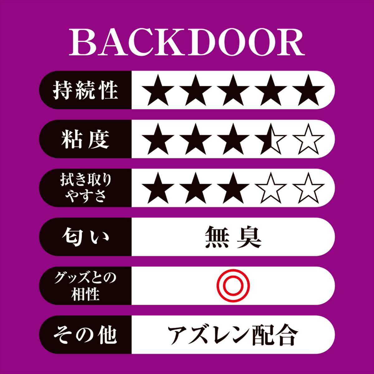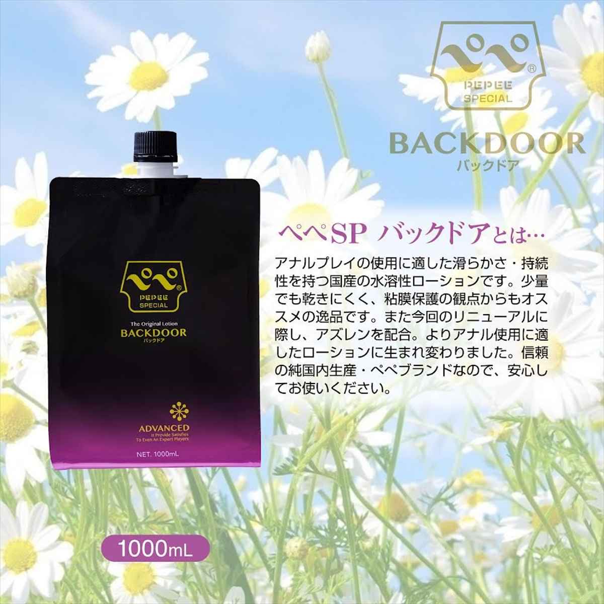 人気ナンバーワンのバックドア用ローション「ぺぺSPバックドア」。詰め替えにも便利、たっぷり使える大容量サイズで登場です。何と言ってもバックドアプレイで大切なのは「適した潤滑性」と「粘度の持続性」ではないでしょうか。それらを高いレベルで兼ね備えていた前作ですが、今回はそこにアズレン(※)を配合しました。また1000mLの大容量サイズなので、詰め替えなどお得に使えます。高粘度、かつ優れた持続性・潤滑性のぺぺSPバックドア。バックドアプレイを楽しむのであれば押さえておくべきローションの一つです。(※)アズレンとはカモミールなどに含まれる成分です。