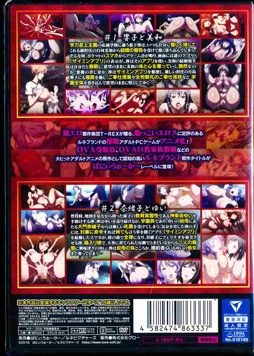 大人気シリーズ「OVA巨乳人妻女教師催●」を1&2パック化!#1とある昼休み、応誠学園の生徒、森下渉はいつも自分に優しく接してくれる副担任の白河美和から結婚の報告を受け、酷く落ち込んでしまう。そんな時、ポケットのスマホからアラ-ム音が鳴り、画面には謎のアプリ、「サイミンアプリ」の表示が。アプリを起動する渉。美和の異変に気づいた渉は美和の結婚相手は渉だと洗脳させ、自分の欲望のままに美和の体と心を奪っていく。偶然なのか、悪魔の差し金か、渉はサイミンアプリを駆使し、厳しい担任の月島響子にも洗脳を施し、フェラチオ授業や全校朝礼でのご奉仕挨拶など、学園全体を巻き込んで欲望のままに堕としてゆく…。#2登校時、地図を見ながら困った様子の教育実習性である神楽坂ゆいを手助けする渉。渉はゆいを学園長まで送り届けるが、学園長であり、ゆいの叔母にあたる大門奈緒子からは厳しい叱責を受けてしまう。気分を害した渉の手には、対象に命令すれば何でも言う事を聞くアプリ、「サイミンアプリ」を起動したスマホが。姪の前で全裸になり、奈緒子にフェラチオを命令させる渉。箱入り娘で、大事に育てられた反動でとまどいながらも二人の痴態に興味津々のゆい。渉は叔母の体どころか、婚約者もいるゆいの処女まで奪ってしまう…。
