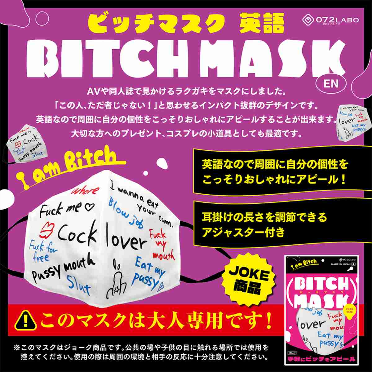 ●このマスクは大人専用です!●AVや同人誌で見かけるラクガキをマスクにしました。●「この人、ただ者じゃない!」と思わせるインパクト抜群のデザインです。●英語なので周囲に自分の個性をこっそりおしゃれにアピールすることが出来ます。●大切な方へのプレゼント、コスプレの小道具としても最適です。●※このマスクはジョーク商品です。公共の場や子供の目に触れる場所では使用を控えてください。使用の際は周囲の環境と相手の反応に十分注意してください。