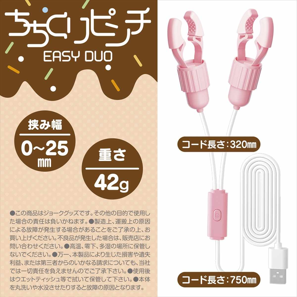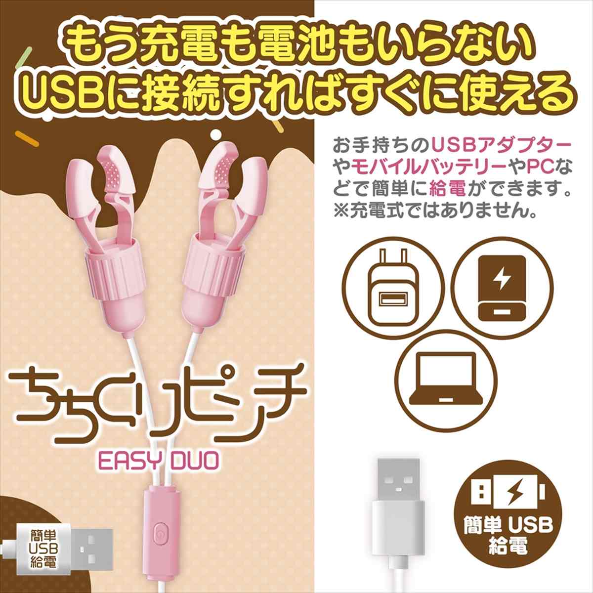 電池のいらないEASYDUOシリーズからピンチャータイプの登場。2つのピンチにモーターが搭載されており12モードのアクション振動、先端部分にはシリコンカパーが付いているので優しく包みこんでくれます。コードの長さも1m程ある為、使いやすい。持っているモバイルバッテリーやUSBアダプターから給電出来るため、使用場所を選びません。本体重量42gと超軽量の為、挟んだ状態を維持してくれます。