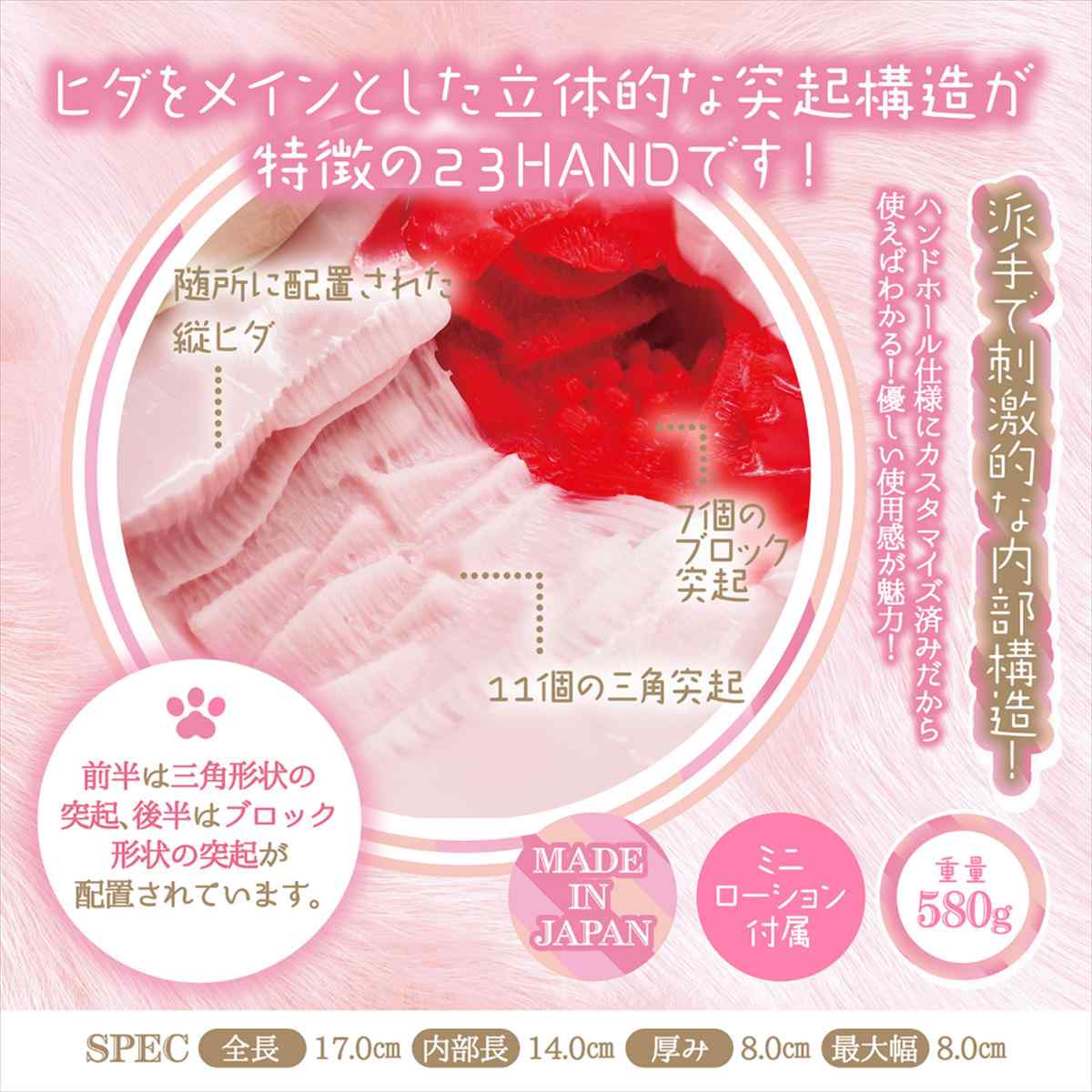 床オナ式PAD23の内部構造をハンドホールに最適アレンジ!「23HAND(トゥースリーハンド)」の新登場です!ヒダをメインとした立体的な突起構造が特徴の23HANDです!前半は三角形状の突起、後半はブロック形状の突起が配置されています。派手で刺激的な内部構造!ハンドホール仕様にカスタマイズ済みだから使えばわかる!優しい使用感が魅力!外側素材は、【サクラ色】の全体を包むしっかり素材。外側は高弾力素材でぎゅぎゅっと!!内部構造の【入口〜2分の1まで】は【サクラ色】の高弾力素材。内部構造の【奥の1/2】は、【赤色】のソフト素材。柔らか素材と奥部分の相性抜群!!「手前で遊んで、奥でフィニッシュ!」のテーマは従来と変わりませんが、奥だけがソフトなためフィニッシュを迎える際の果て感が圧倒的に違います。まるで本物のような果て感!そんな最高の内部を「23HAND」で是非お試しください!!