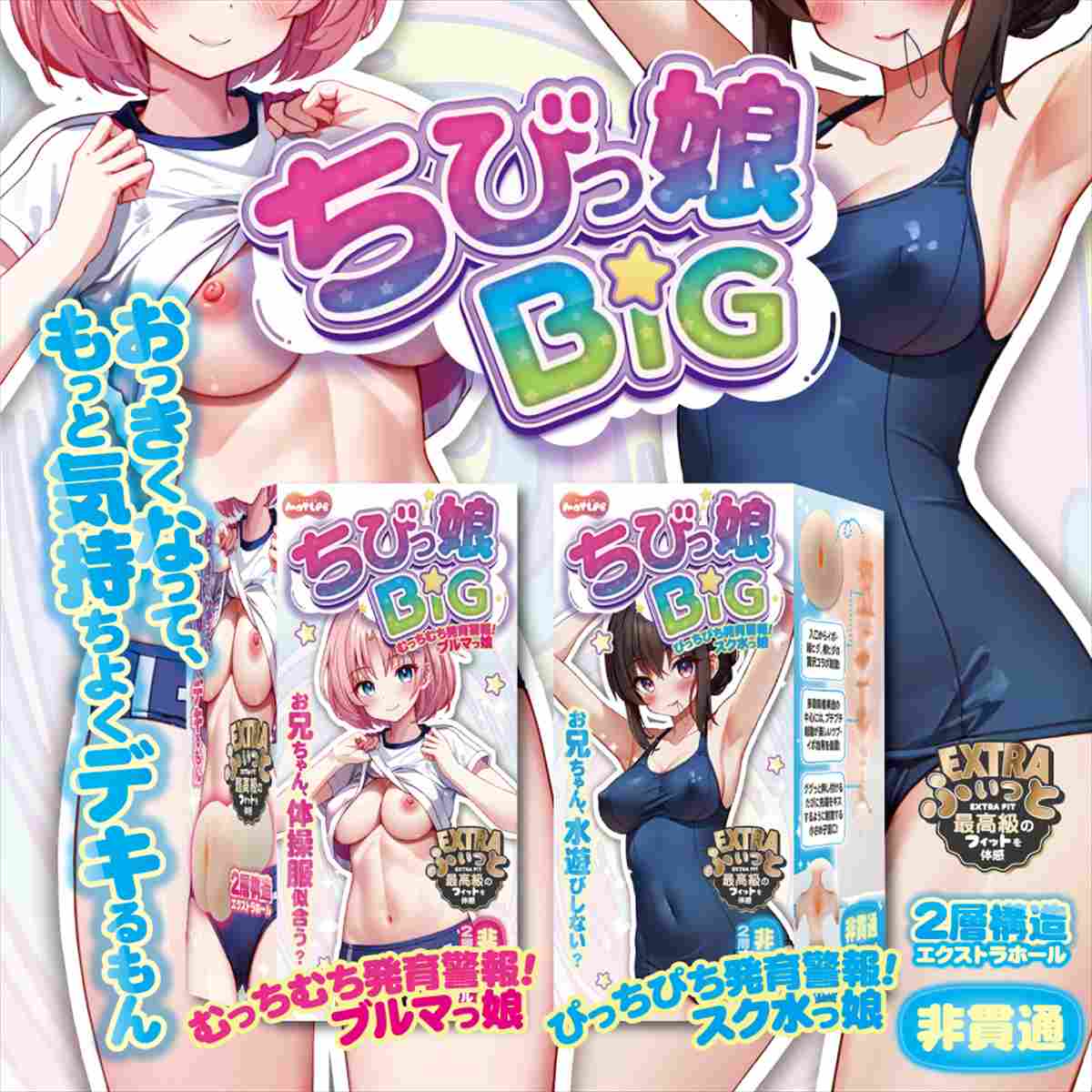 入口はググっと締め付け、奥は優しく包み込む。硬さの違う2つの素材が織りなす新しい快感。大人気商品「ちびっ娘mini」がBIGになってリニューアル。挿入口付近はググっと締め付けてくる少し硬めの素材を使用。奥に進むほど優しく包み込む少し柔らかめの素材に変化。素材の硬さの変化をグラデーションで楽しめる、新感覚ホールです。スク水っ娘は連続したヒダ刺激に、間に散りばめられたイボがアクセントを生むイボヒダ混合タイプ。最奥の子●口ギミックは亀●の先に優しくキスし射●感を促します。