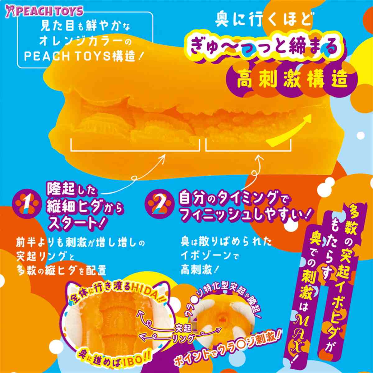 見た目も鮮やかなオレンジカラーのPEACHTOYS構造!「Air2HAND」が誕生!「床オナ式PADAir2」の突起リングと奥イボの刺激をハンドホールでも使いたい!とのご要望にお応えしました!「床オナ式PADAir2」は、奥に進めば高刺激に締まる内部構造のため、床オナ式スタイルでは体重が掛かって程良くなりますが、ハンドホールでは、全体的に肉厚感が必要なため、少し大きめになっています。さらに、通常の床オナ式PADで使用している高弾力ではなく、素材自体も変更。内部構造もハンドホールとして最適に使えるようカスタムしております。ウラ〇ジ特化型突起や隆起!ポイントでウラ○ジ刺激!全体に行き渡るHIDA!奥に進めばIBO!!奥に行くほどぎゅ〜っっと締まる高刺激構造多数の突起イボヒダがもたらす奥での刺激はMAX!床オナ派ではない皆様にもオレンジの「Air2HAND」をご堪能いただけますと幸いです♪